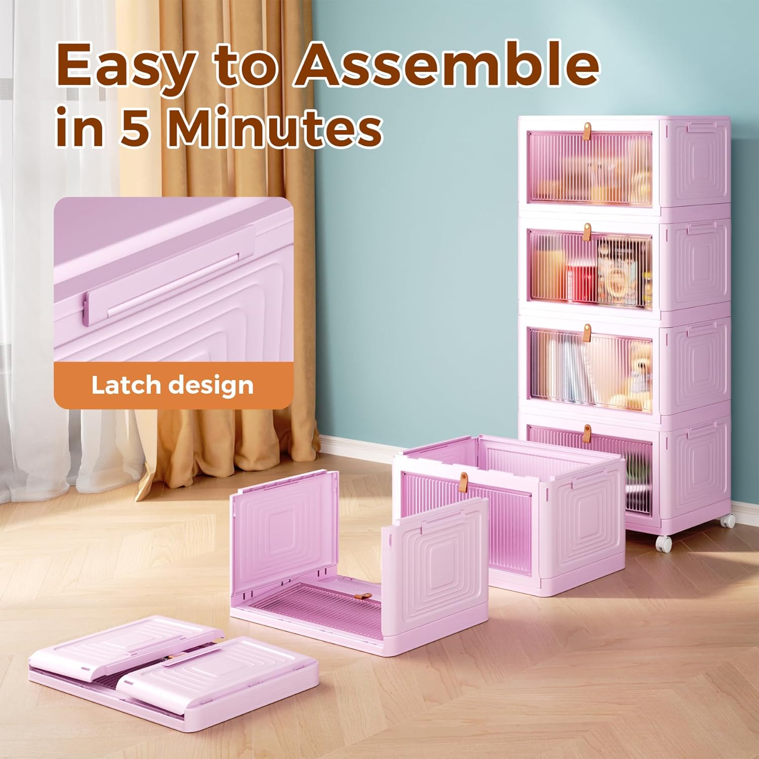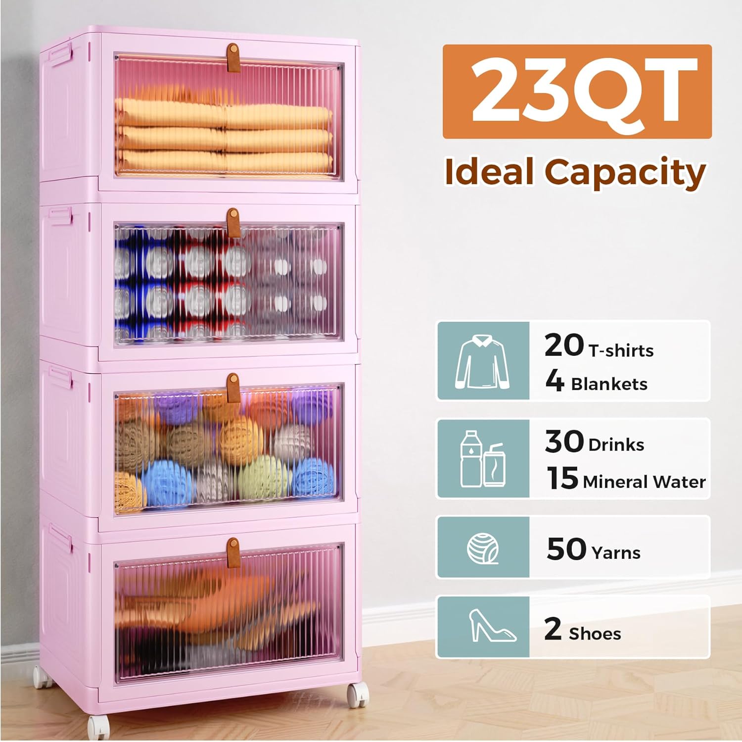 4 Tier Stackable Plastic Storage Bins with Lid and Wheels - 23 QT Closet Organizers and Foldable Storage Containers, Organization Boxes for Craft, Home, Pantry, Dorm, Pink