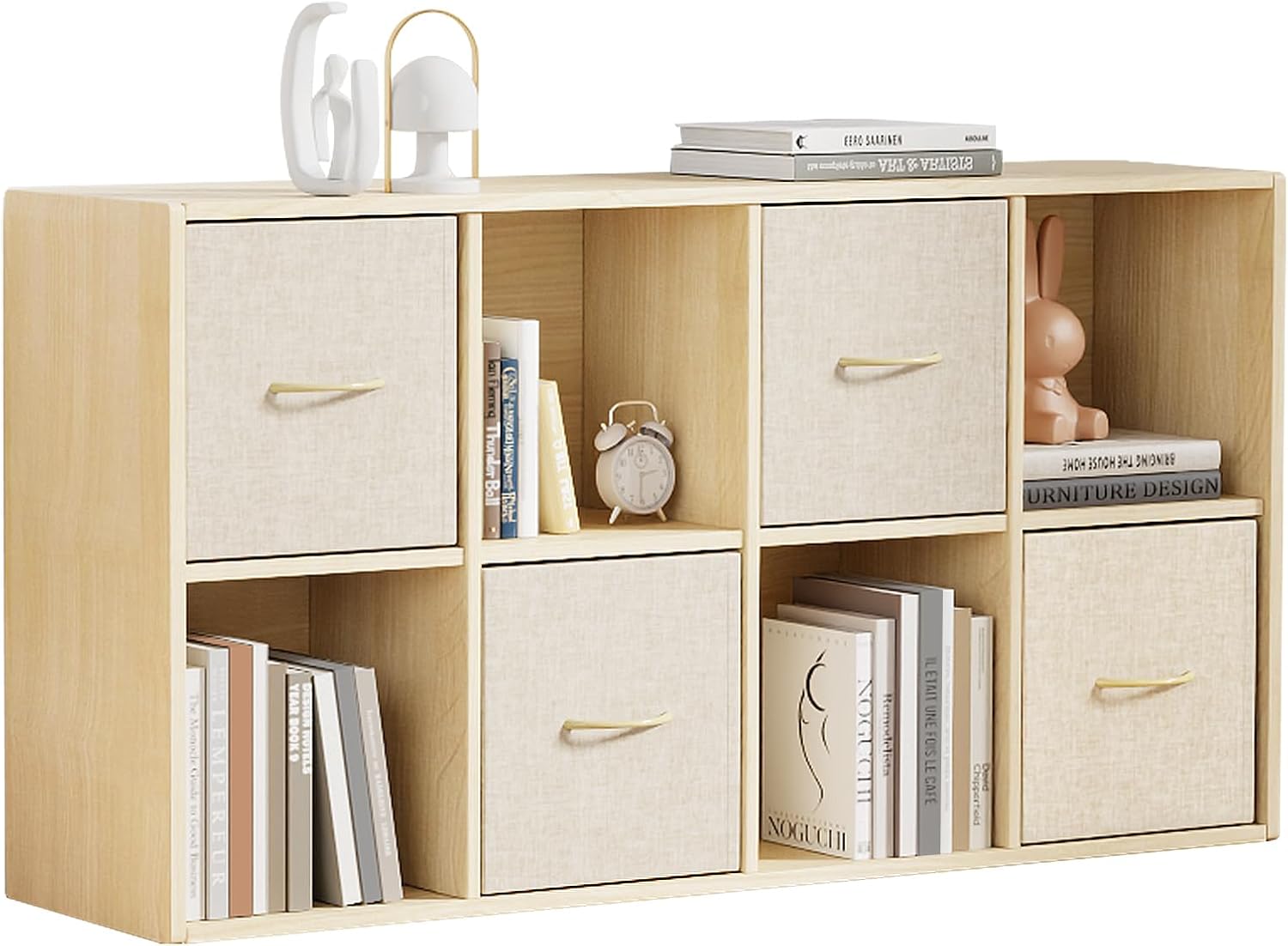 8 Cube Storage Organizer - Solid Wood Bookshelf with 4 Storage Bins, Cube Shelf with 2 Removable Back Panels, Vertical or Horizontal Bookcase, Open Book Shelf for Bedroom, Living Room, Office