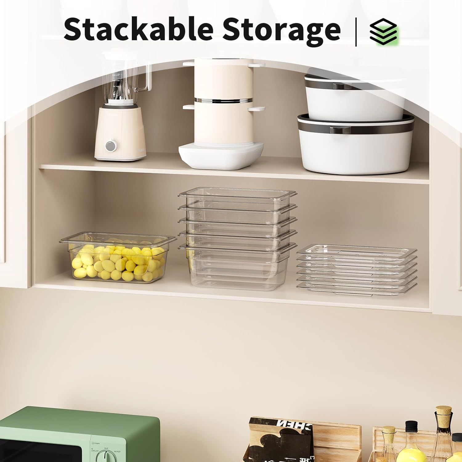 1/4 4'' 6 Pack Plastic Food Pans With Lids, Clear Food Pan, Commercial Stackable Polycarbonate Freezer-Safe for Fruits Vegetables Restaurant Kitchen