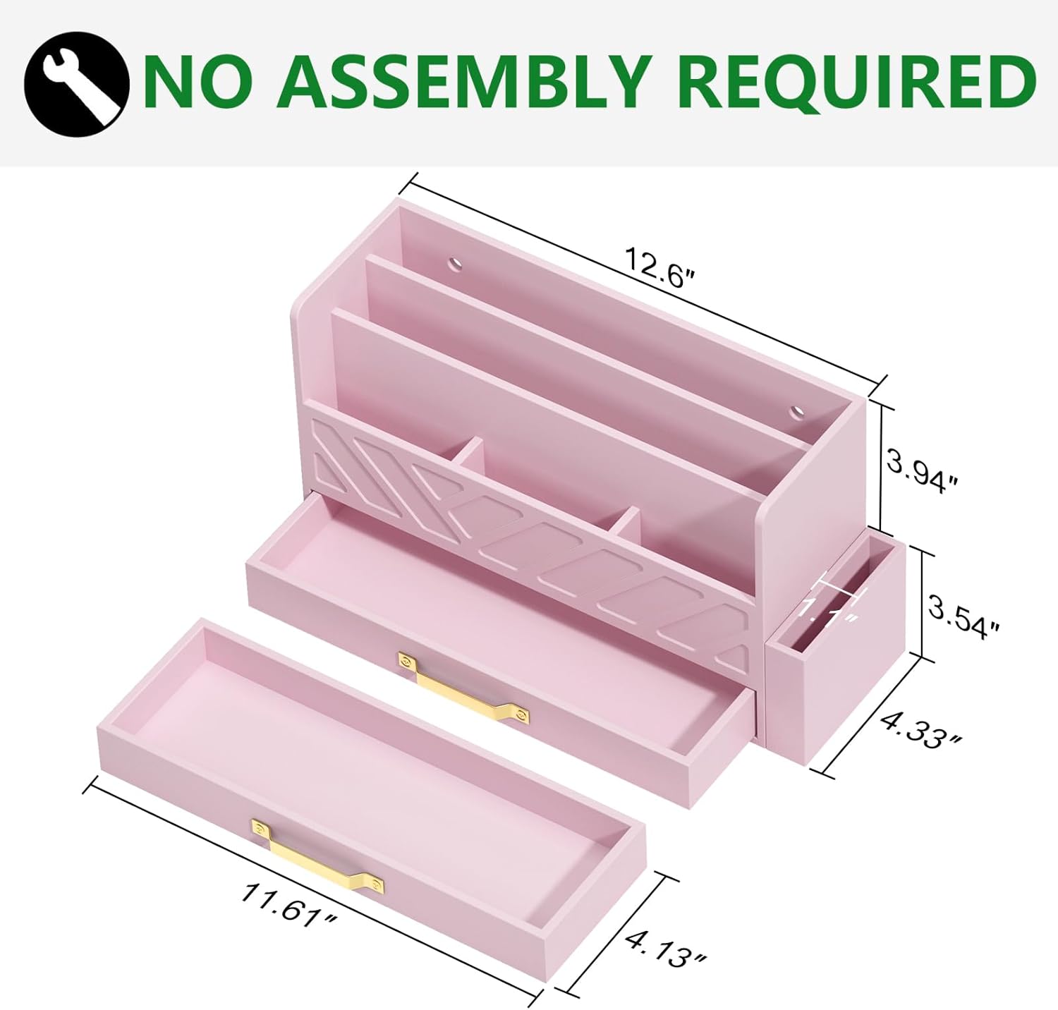 Bamboo Desk Organizer Mail Holder Countertop Wood Desk Drawer Tabletop Storage Box Pen Holder Letter Sorter Makeup Organizer for School Home Office Supplies with Pen Holder Pink