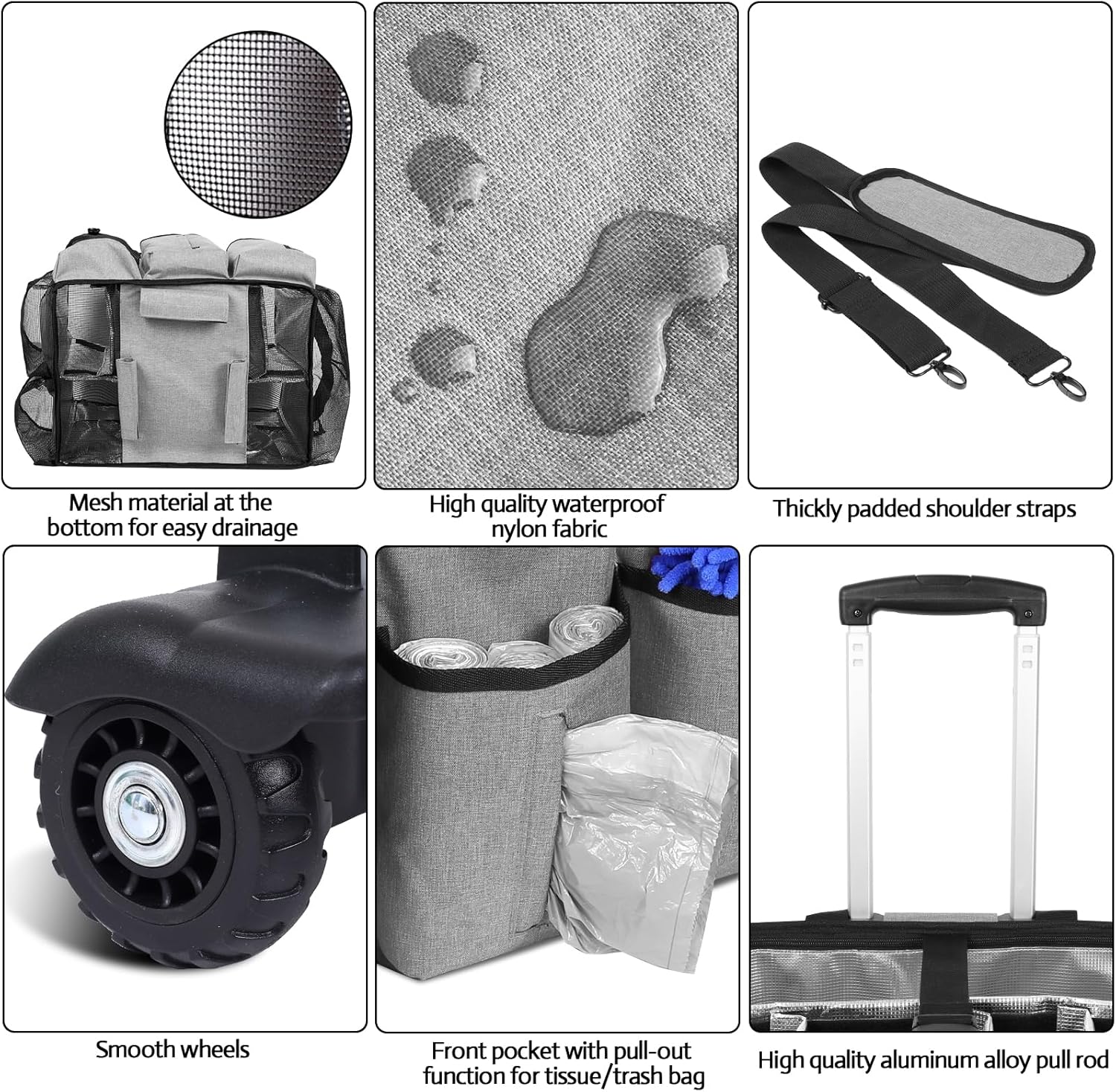Extra large Rolling Cleaning caddy bag with Detachable, Foldable Trolley Portable Cleaning Cart for Housekeeping Cleaning caddy with Adjustable Shoulder Strap and Multiple Storage Pockets