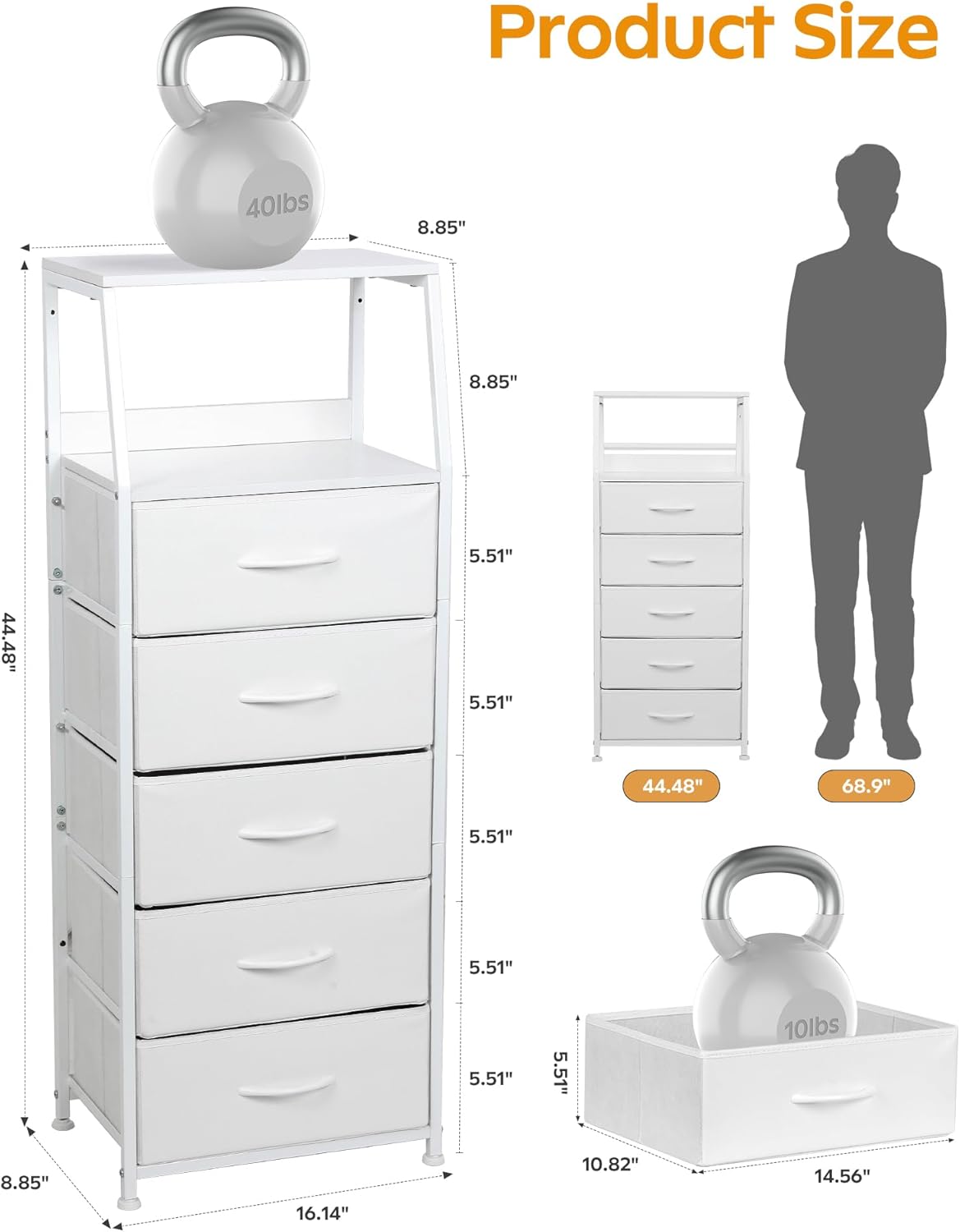 Dresser for Bedroom, Fabric Nightstand Tall Dresser & Chests of Drawers with 5 Drawers, Vertical Organizer Storag, Hallway, Entryway White