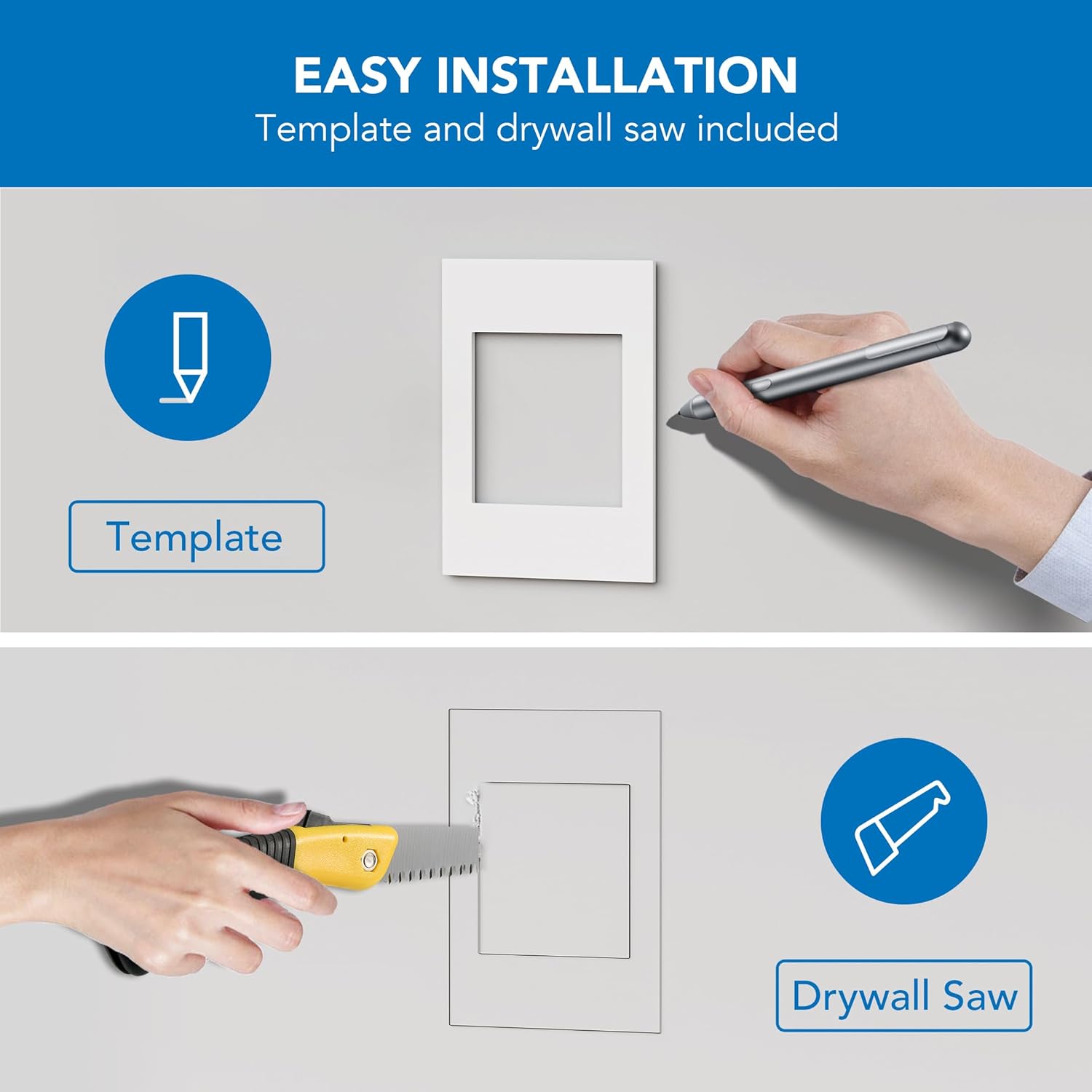 - What’s in the box – Complete kit includes 2 wall plates (large plate 6.3" x 7.9" and small plate 4.5"), each with pre-installed screws for faster assembly, 9-ft extension power cord, drywall saw, cutting template, and instructions everything you need in one package.