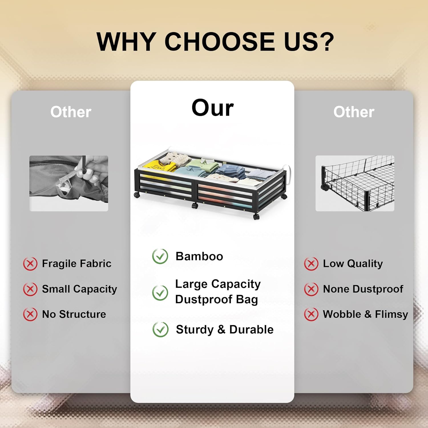 - ✅【Sturdy Under Bed Storage】:Our underbed storage units are built to last with high-quality 100% Real Bamboo,Beautiful appearance compared,oasting 4 rotating wheels with capacity of 120lbs, 48L large capacity dustproof cover bags hile the load-bearing capacity and durability are dramatically increased ,It's a versatile storage solution that can be customized based on your needs.