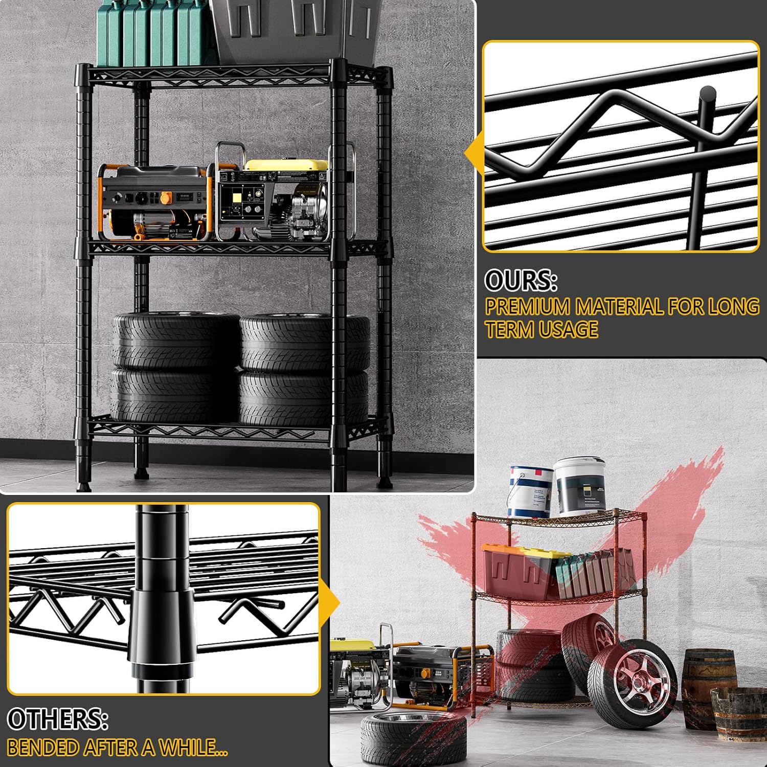 - PREMIUM QUALITY MATERIALS: Crafted from high-quality carbon steel. This series of storage shelves has 19.1mm pipes, which greatly improves its load-bearing capacity, and ensures its stability and durability. Each shelf holds up to 250 LBs on feet