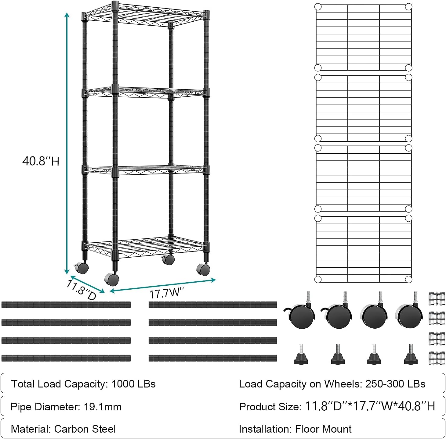 4-Shelf Adjustable Heavy Duty Steel Wire Rack, Adjustable Storage Shelving Unit with Wheel for Kitchen, Garage, Laundry Black 11.8" D x 17.7" W x 40.8" H