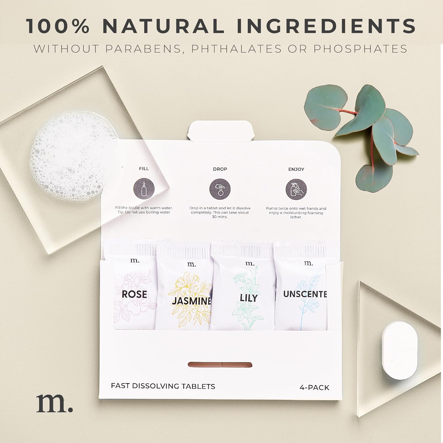 - This Soap Refill Pack Includes: 4 Rejuvenating Soap Refills in Rose/Jasmine/Lily/Unscented and 1 clear foaming soap bottle. Bottle will come with preprinted hand soap labels.