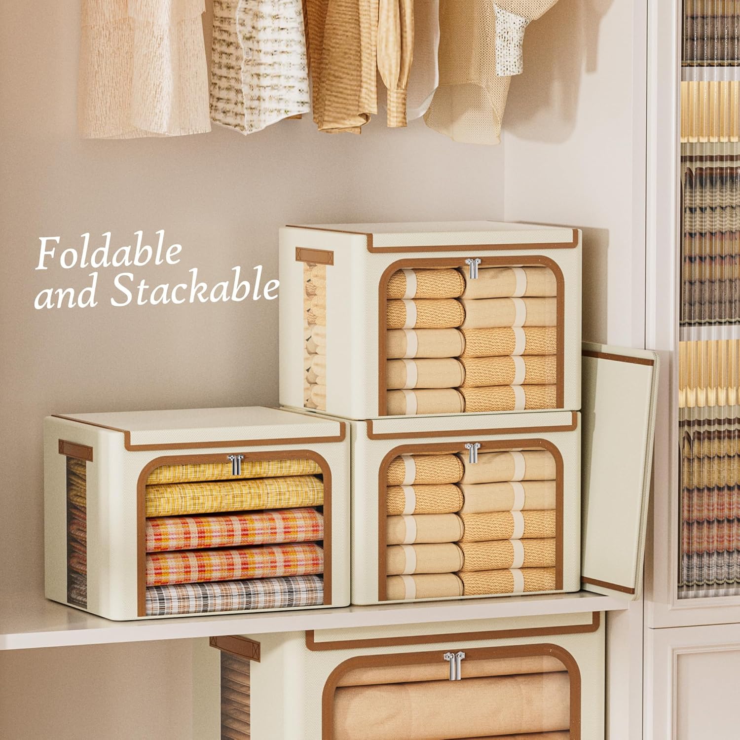 Yecaye Clothes Storage Bins with Metal Frame, Foldable Clothing Storage Bin with Lid, Stackable Oxford Fabric Organizer Box With Clear Window & Zippers & PU Leather Handles (3 Pack,Beige,40L)