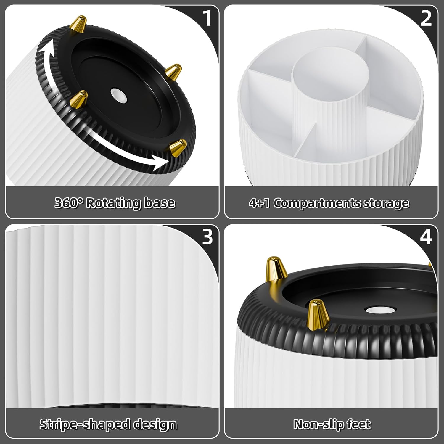 Marbrasse Desk Organizer, 360-Degree Rotating Pen Holder, Desk Organizers and Accessories with 5 Compartments Pencil Holder, Art Supply Storage Box Caddy for Office, Home (White+Black)