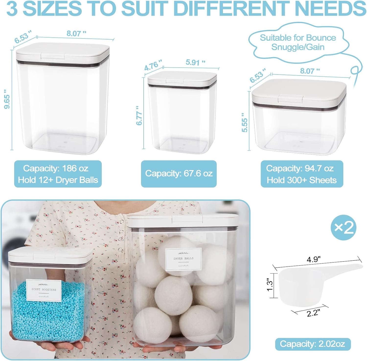 - 3 SIZES TO SUIT DIFFERENT NEEDS: This large-capacity laundry container set includes a large 186 oz laundry jar; a medium 67.6 oz laundry jar; a 94.7 oz dryer sheet container (holds up to 300–320 sheets); 2 spoons; 6 beautifully designed labels & 6 blank labels
