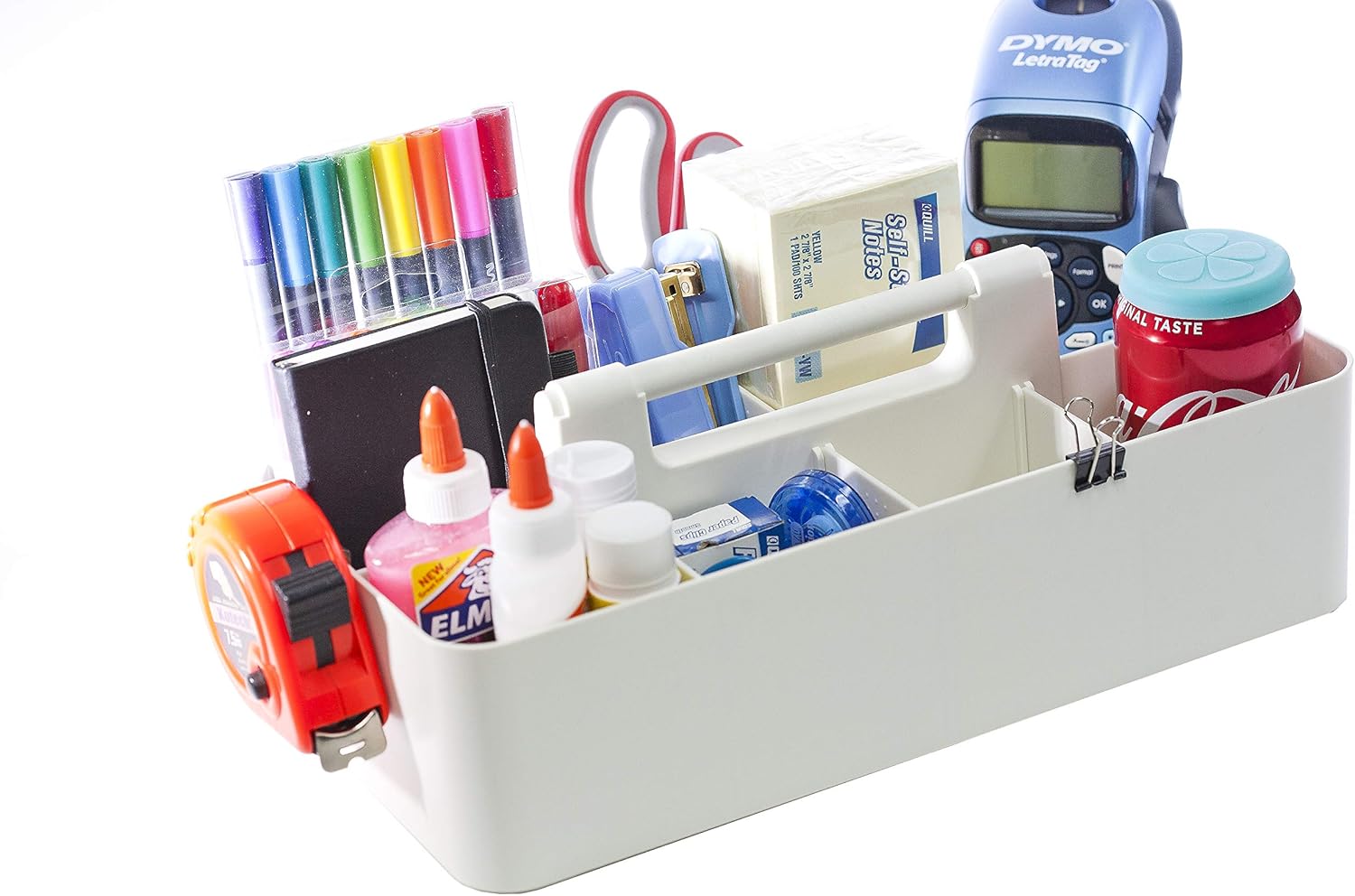 - PORTABLE: Equipped with an easy-carry round smooth handle, this caddy makes transporting goods from shelf to cabinet or desktop a breeze. Just grab and go! The open tops and divided compartments make it easy to see what’s inside and quickly grab what you need. Use these convenient storage caddies to keep office desk items organized, children's crafting items tidy, and school supplies in check. Perfect for both home and commercial workspaces.