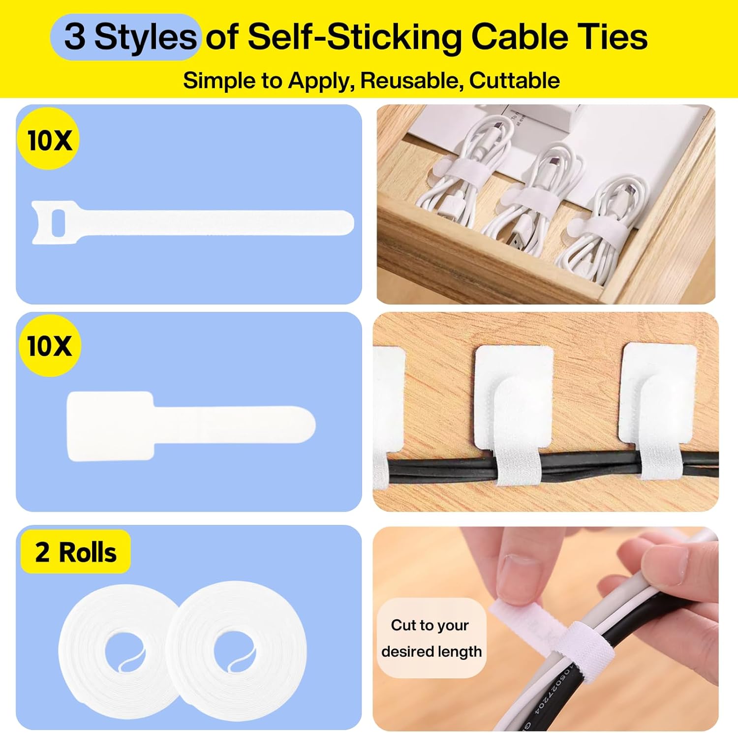 - 200 Zip Ties & Strong Mounting Bases: Comes with 200 Heavy-Duty plastic zip ties and 20 mounting bases. These wire ties are robust, ideal for holding heavier cable bundles securely in place. Perfect for organized and reliable desk cable organizer.