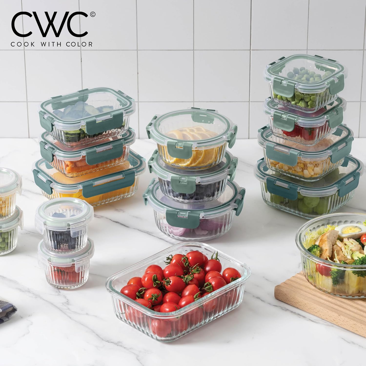 COOK WITH COLOR Premium 32-Pc. Borosilicate Glass Food Container Set with Dividers - 4 Rectangles, 8 Rounds, 4 Squares - Leakproof Lids - Meal Prep, Storage, Fluted Ombre Green