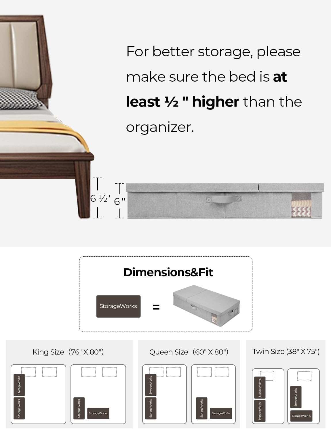 - Large Capacity: With dimensions of 33"L x 17"W x 6"H inches, the under bed storage containers offer ample space for storing a range of items, including clothes, blankets, bedding and shoes, maximizing your underbed storage space and organizing your bedroom. Please make sure that your bed is at least 6.5 inches high for better use.