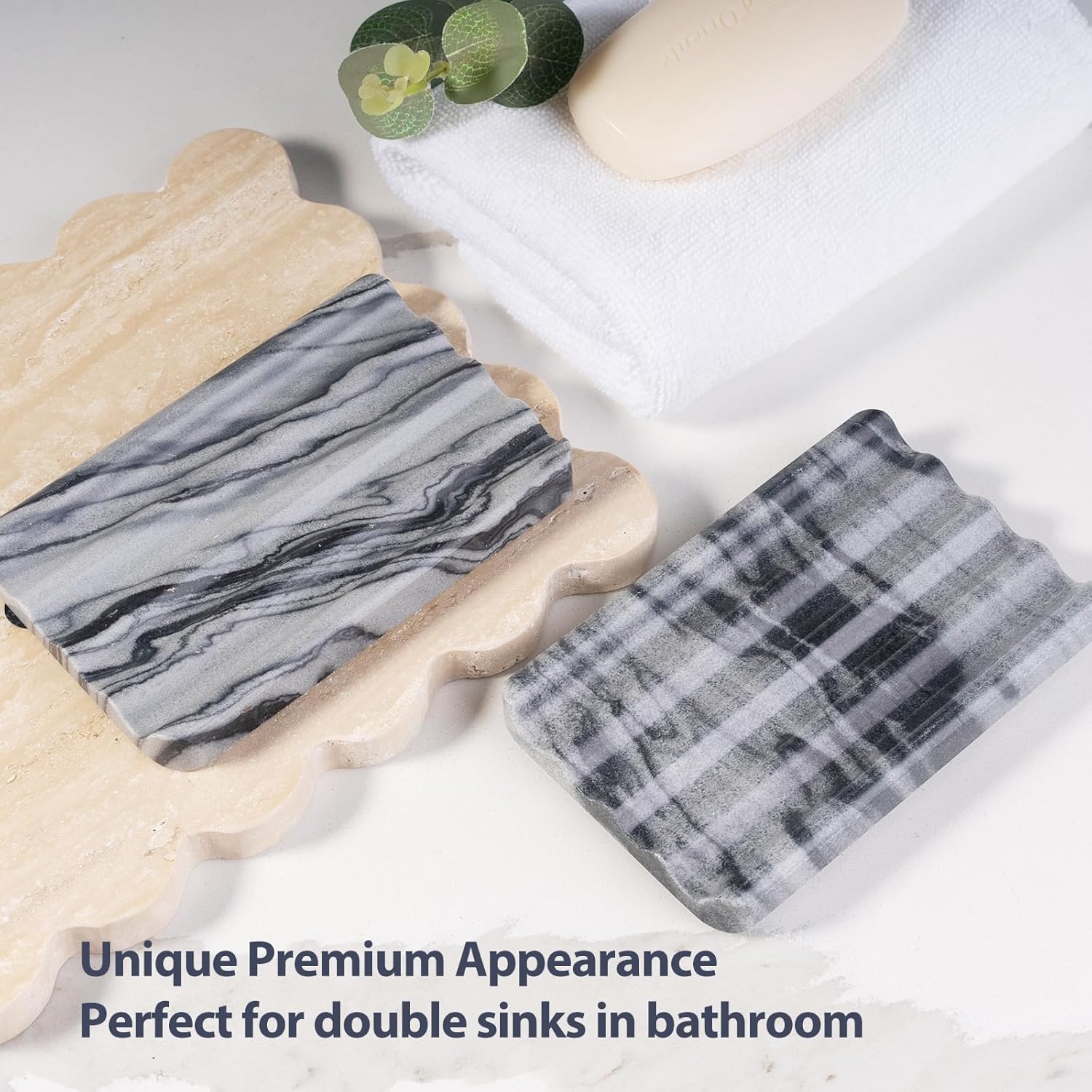 2 Pcs Soap Holder for Bathroom, Marble Soap Dish for Kitchen Countertop, Tray with Creative Wavy Design, Soap Saver for Bath Tub, Sponges, Italian Natural Stone(Monte Grigio)