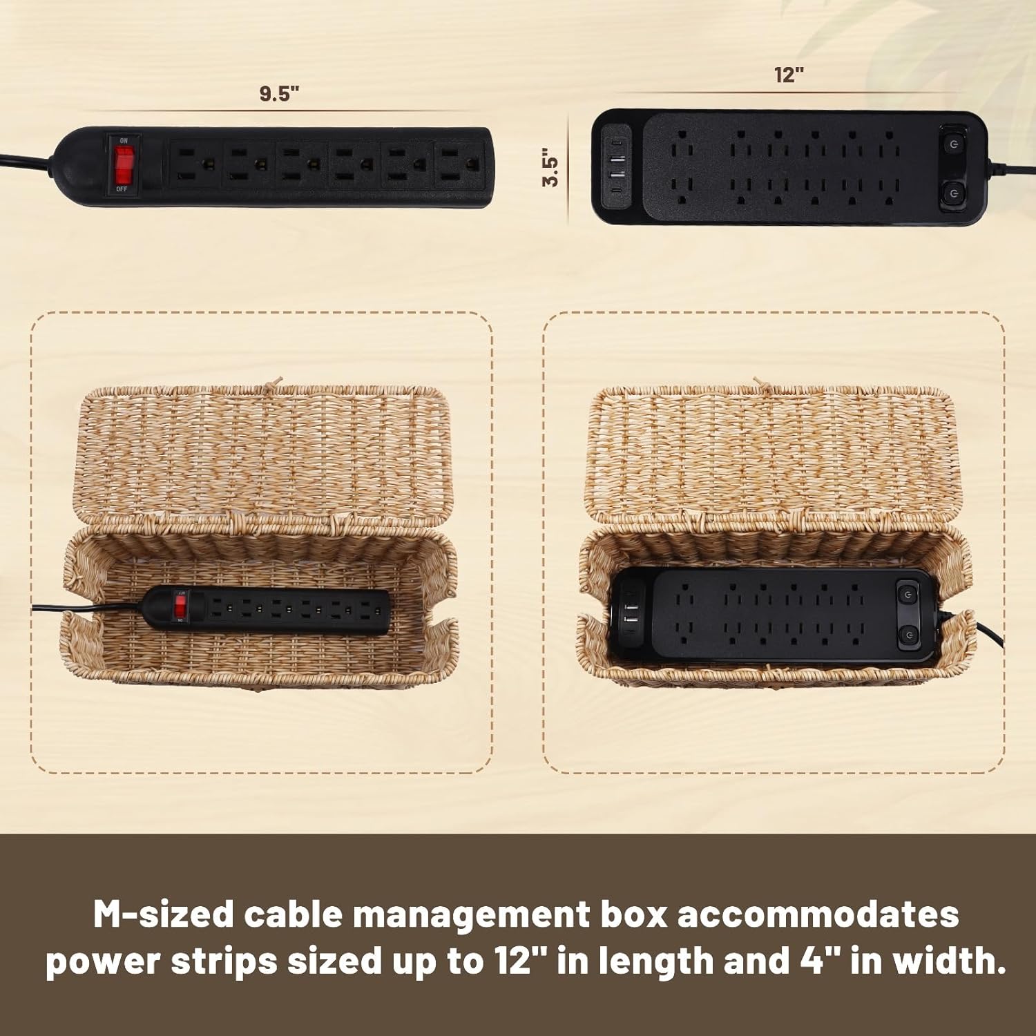 BROWNLILY Cable Management Box, Rattan Style Cord Organizer for Desk Cord Hider Outlet Covers Baby Proofing for Power Strip TV PC Router Charger Under Desk Storage - Natural Small