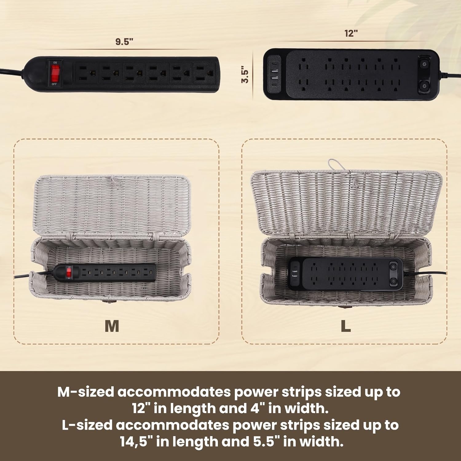 - Safe Material & Ventilation System: Brownlily cord management box ensures a sturdy thickness with safe faux rattan material. The breathable cord holder effectively prevents surge protector power strip from overheating due to its multiple air holes