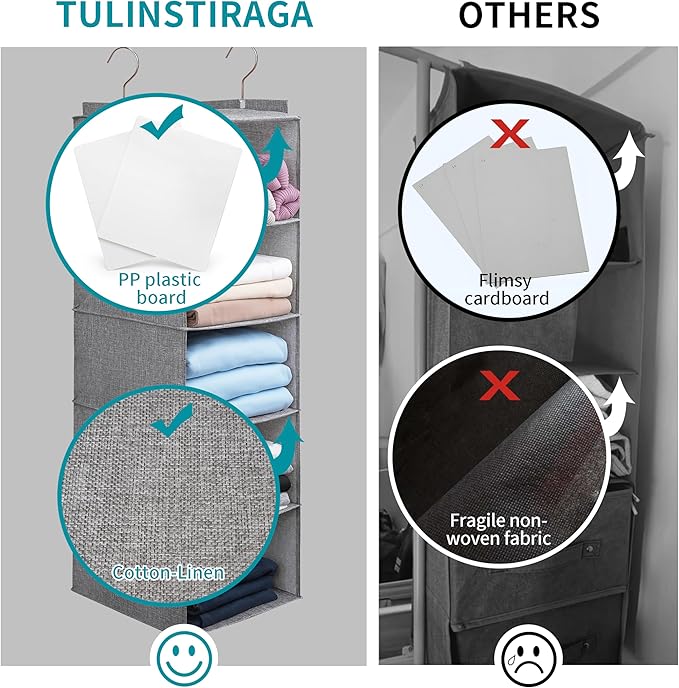 - The foldable design of this hanging closet organizer allows for easy storage and transport, making it perfect for small spaces, dorm rooms, and travel.