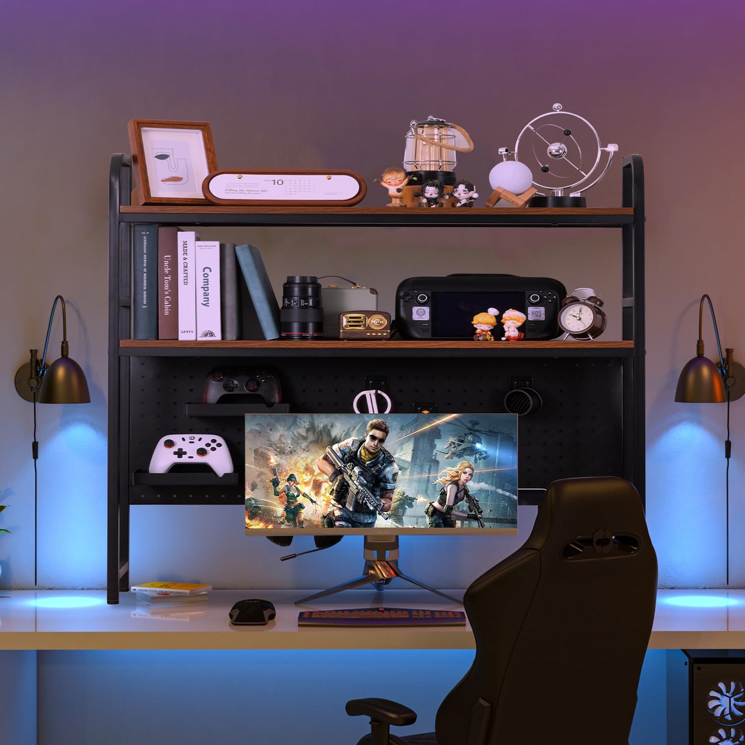 deli Desktop Bookshelf, Metal Desk Shelf Bookcase with Pegboard Hooks Set, 2 Tier Display Rack, Multipurpose Wood Desktop Hutch Storage Organizer for Dorm Office Home