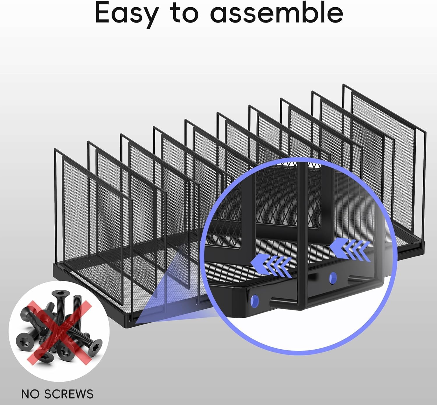 - [Easy to Assemble] No screws! JMHUD folder holder is very easy to assemble on the desk, just tighten a few screws and insert the hook at the bottom of the vertical file into the small hole in the base. So you can use it faster, providing you with a perfect work partner to deal with the messy pile of documents.