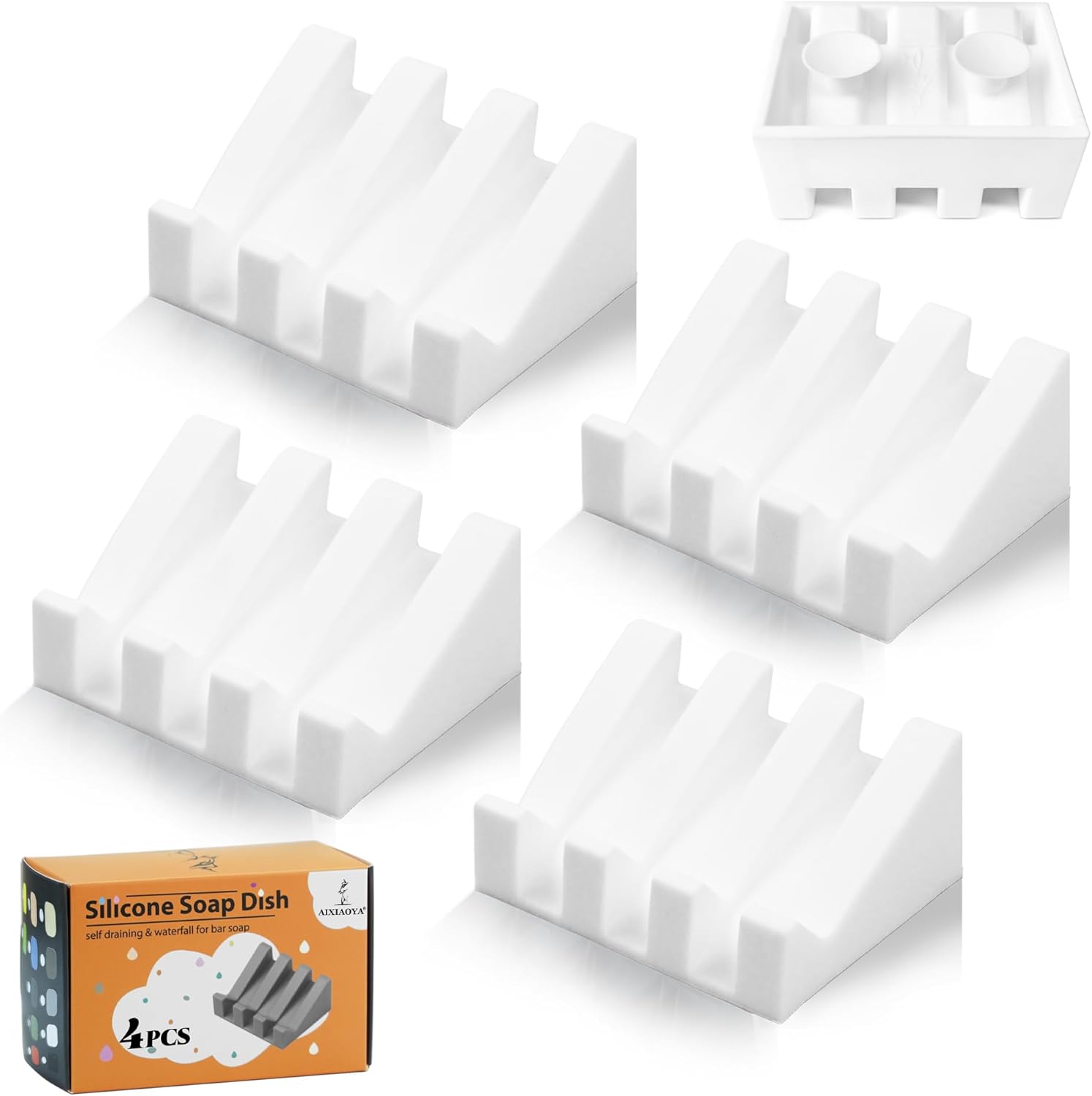Silicone Soap Dish with Drain, Upgrade Double Suction Cups at The Bottom for Anti-Slip and Stability, Soap Dish Shower Waterfall Bar Soap Holder Tray with Drain Soap Holder (4, White)