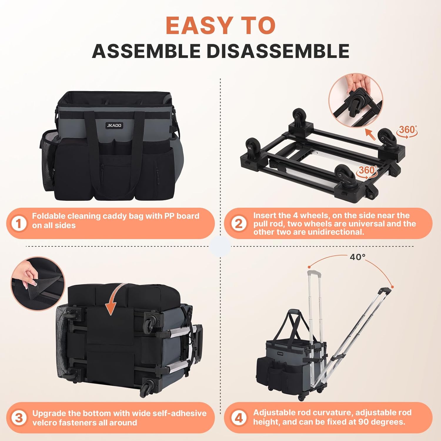 - 【Collapsible Support Panel, Quick Storage】The JKAOO rolling cleaning caddy bag has foldable PP boards on both sides, and support boards on all sides, and the shape is spacious and sturdy. It features 4 large Velcro buckles on bottom to secure the bag to the pole platform and bag side's cross-bar fixed design to prevent collapsing or tilting when filled with cleaning tools. The 4-level telescopic double rod handle can be adjusted to a maximum of 38.2 inches / 97 cm to meet push-pull requirements