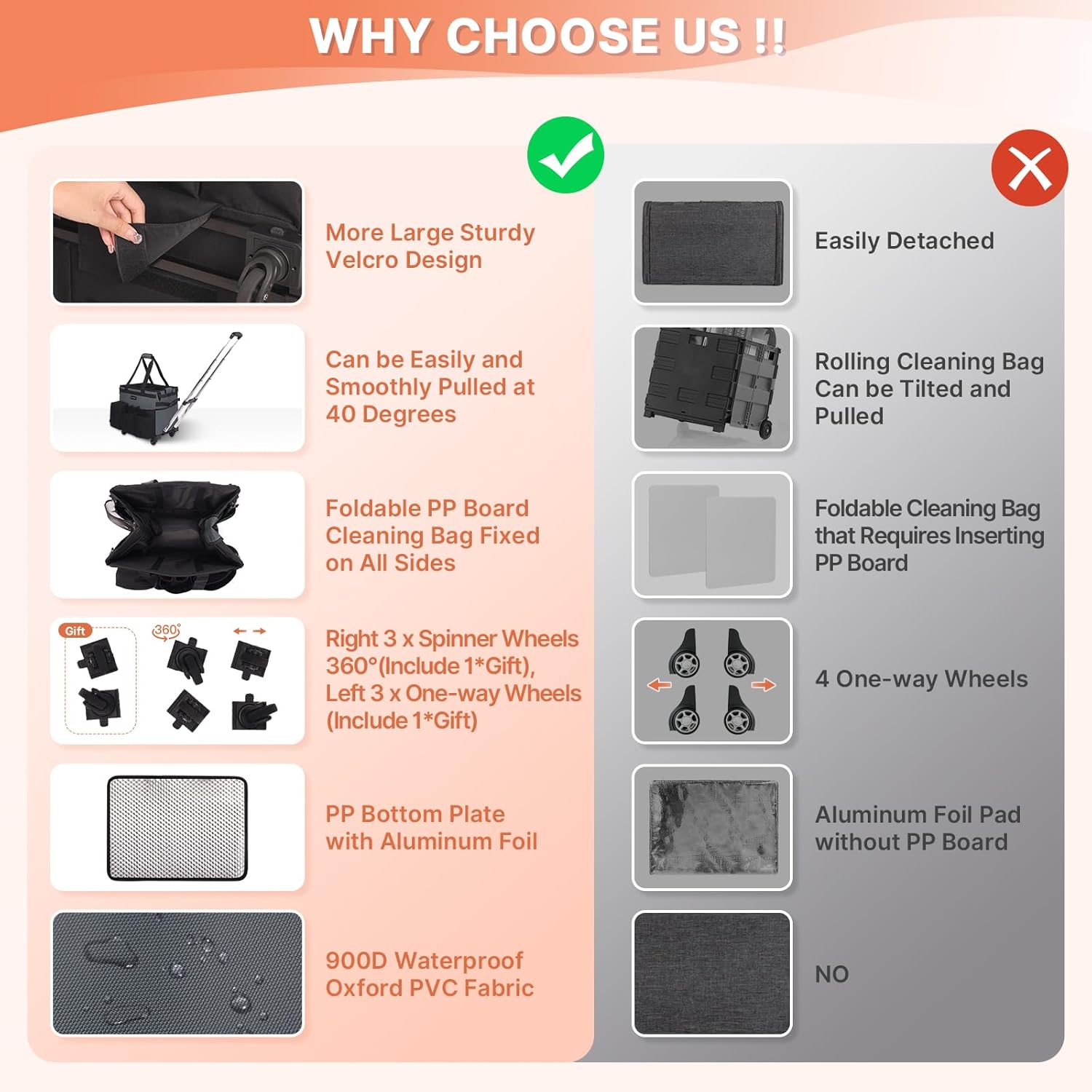- 【90 °& 40 ° Adjustable Rolling Cleaning Caddy Bag】Rolling cleaning bag comes with 1 detachable shoulder strap and fixed double handles, both padded, it also comes with a detachable cart with 4 detachable inserted wheels (2 spinner wheels 360 °, 2 one-way wheels), and 2 extra wheels for later replacement. A 90 °& 40 ° adjustable pull bar is more agile than a traditional trolley and provides a more portable service