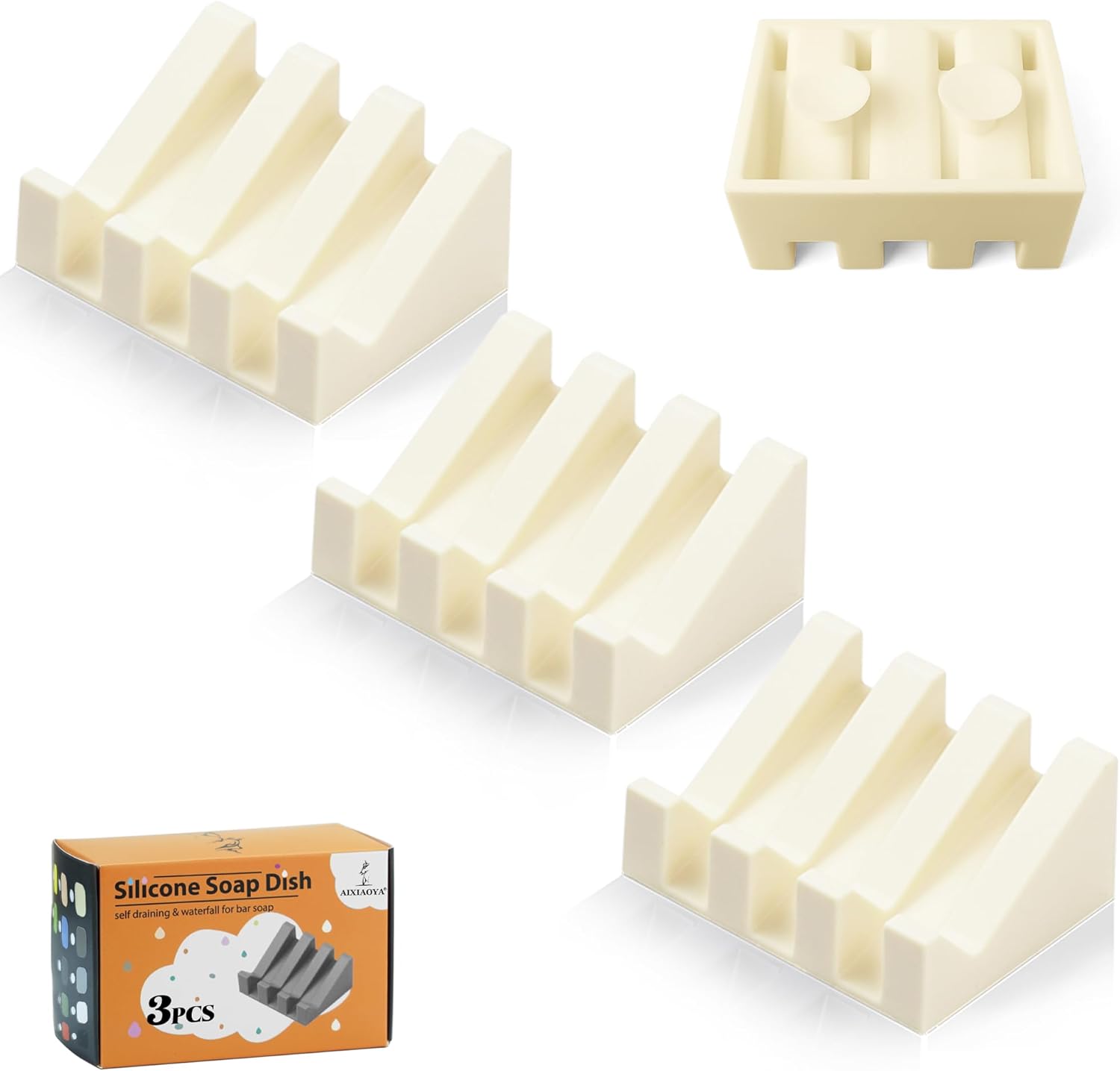Silicone Soap Dish with Drain, Upgrade Double Suction Cups at The Bottom for Anti-Slip and Stability, Soap Dish Shower Waterfall Bar Soap Holder Tray with Drain Soap Holder (3, CreamWhite)