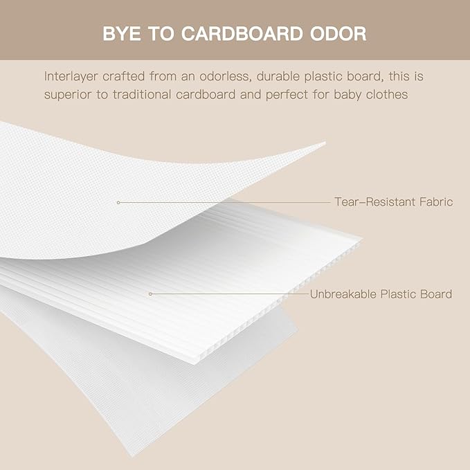 - Durable Design:Crafted from sturdy non-woven fabric, these dresser drawer organizers feature high-quality stitching for enhanced durability. Reinforced with heavy plastic boards on the sides and bottom, these bins maintain their shape over time. They are also odorless, making them ideal for storing baby clothes