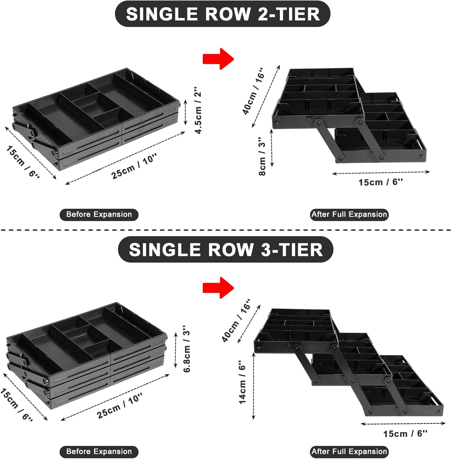 - 📏Compact Size: These versatile options ensure a perfect fit for any drawer. Designed to fit seamlessly into most standard drawers, providing an organized solution without compromising space. Single-row 2-tier: 10'' x 6'' x 2''; expands to 16'' x 6'' x 3''. Single-row 3-tier: 10'' x 6'' x 3''; expands to 16'' x 6'' x 6''.