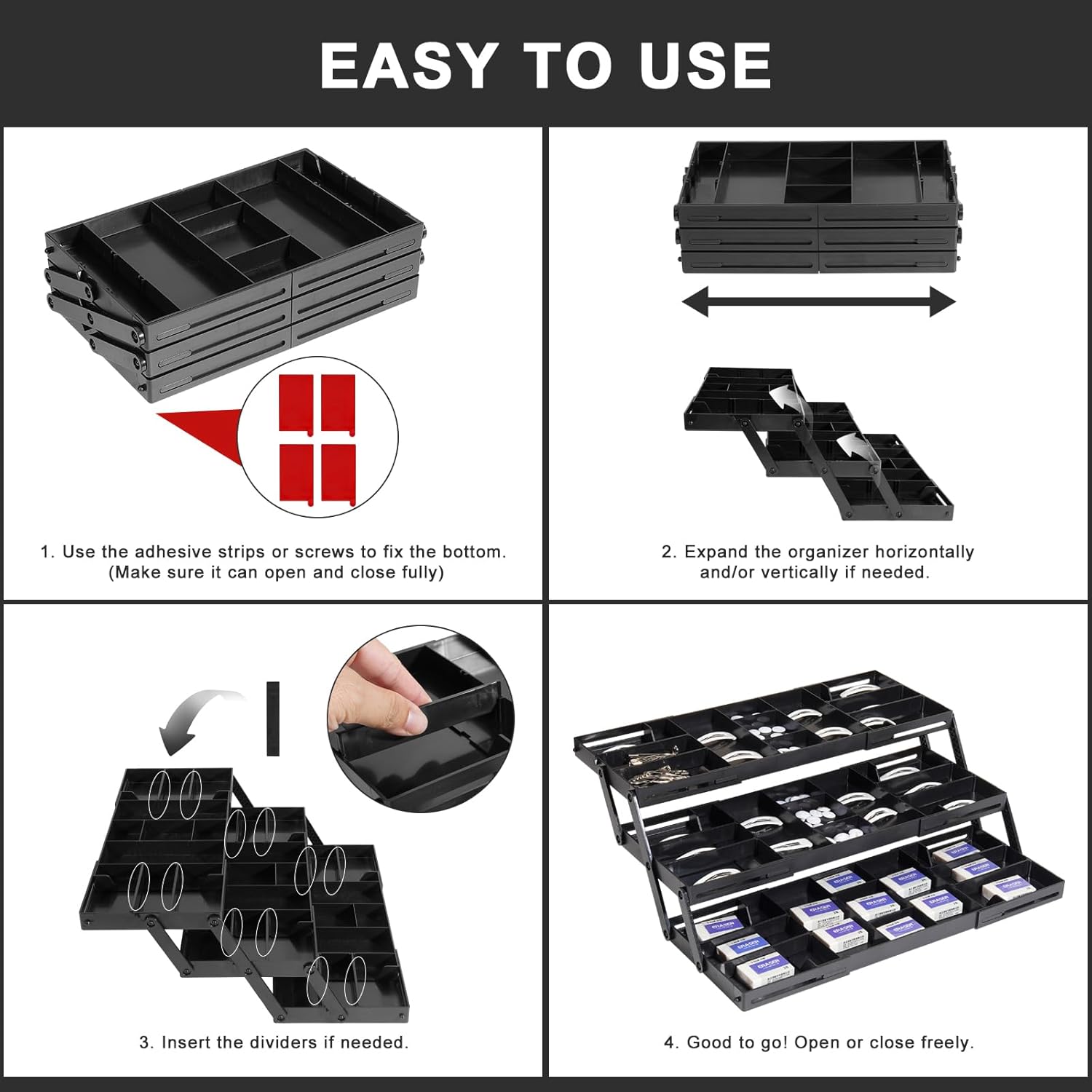 Aobiono Multi Level Smart Drawer Organizer, Multi Tier Expandable Storage Collapsible Foldable Trays for Jewelry, Cosmetics, Makeup, Tools, Battery (Black, Single Row - 3 Levels)