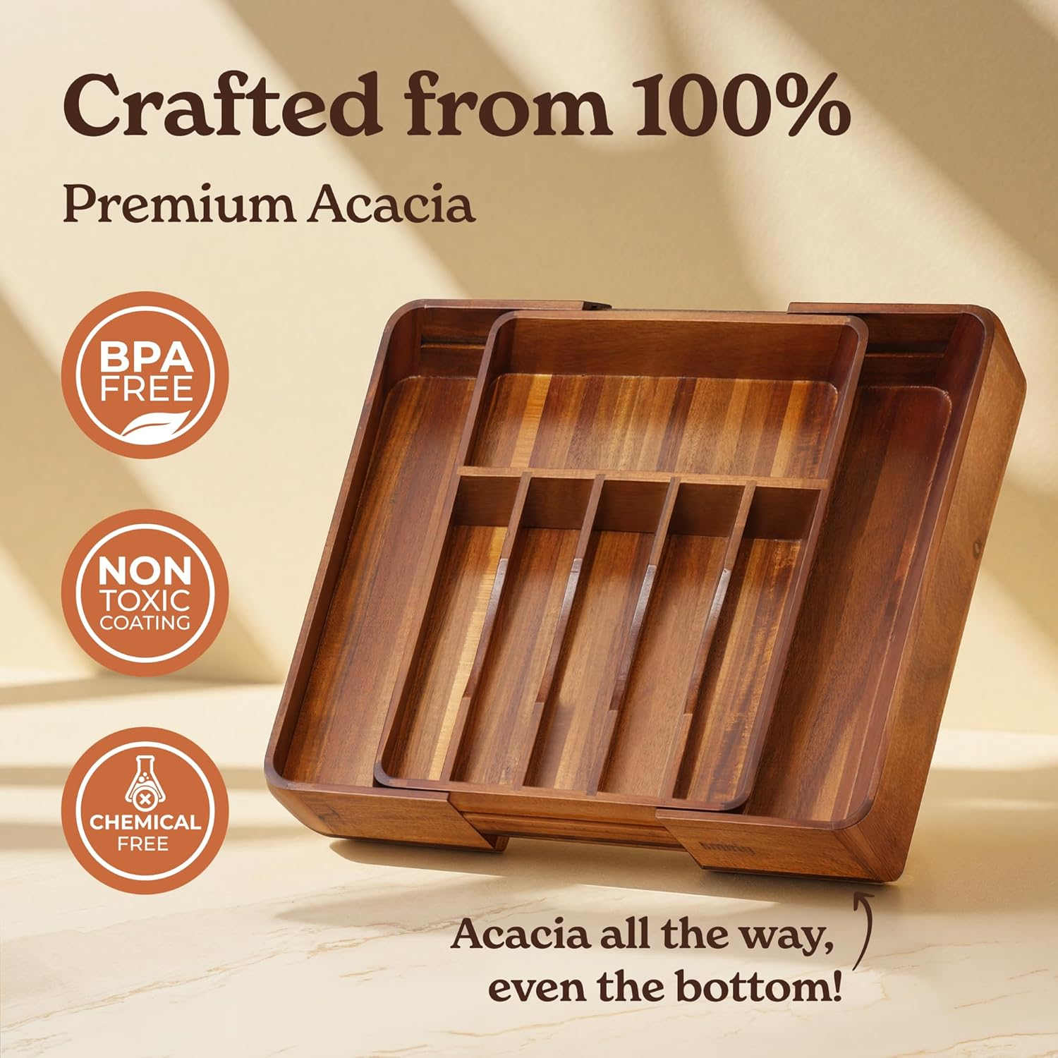 - A Must-Have Kitchen Accessory - Crafted from natural Acacia, our silverware drawer organizer blends with any decor. With a reinforced base and deep compartments, this kitchen drawer organizer fits most drawers, providing ample storage space.