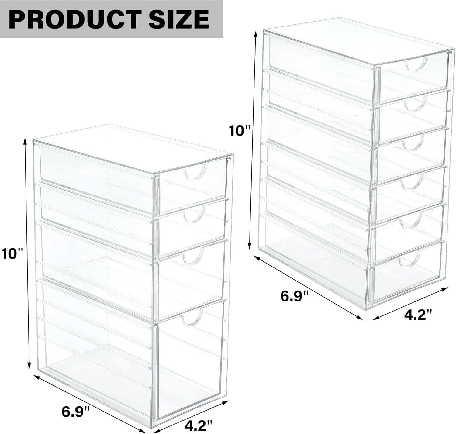 - Multiple Sizes and Expandable: This set includes 2 individual acrylic drawer units, offering a total of 10 drawers, these clear drawer organizers provide customizable combinations to meet your specific storage and organizational needs. The size of each acrylic drawer units is 4.2x6.89x9.92 inches. The office supply organizer can be stacked vertically or expanded horizontally, allowing integration with other sizes and dimensions of storage solutions available in our store.