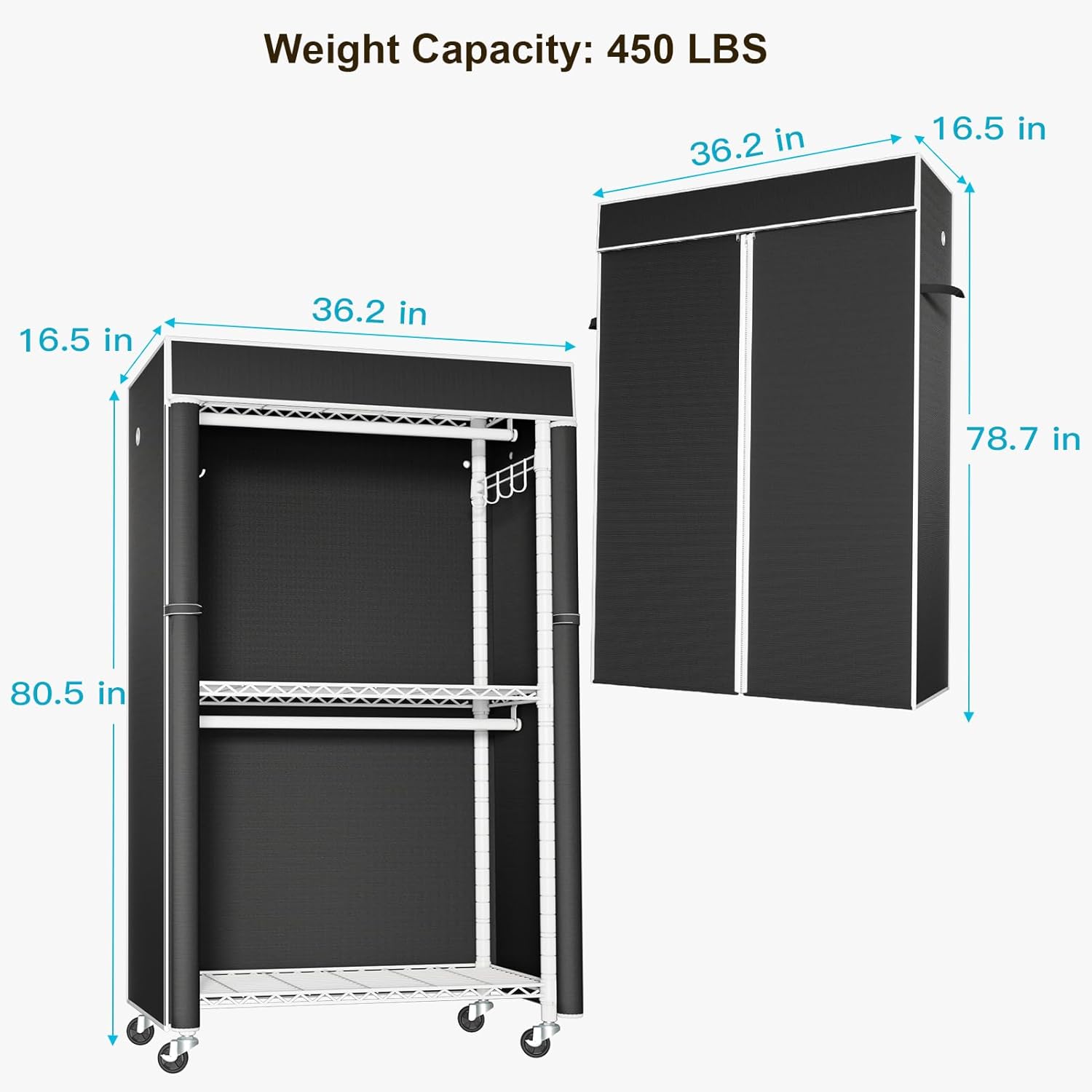 - Overall Dimension: The covered clothes rack whole size is 36.2"W x 16.5"D x 80.5"H, which combines with 3 wire shelves and 2 hanger rods for loading 450 lbs