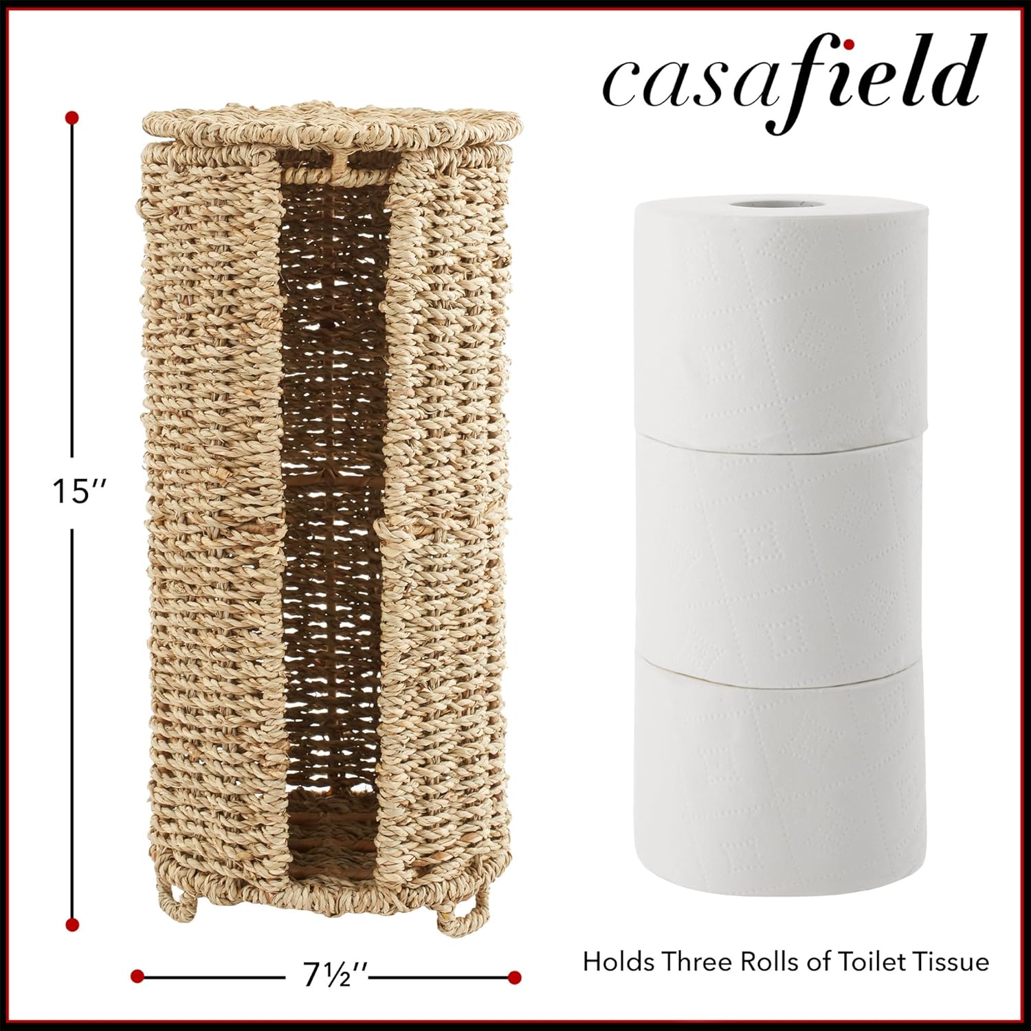 Casafield Free Standing Toilet Paper Storage Roll Holder with Lid - Natural, Fits 3 Rolls, Seagrass Bath Tissue Organizer for Bathroom