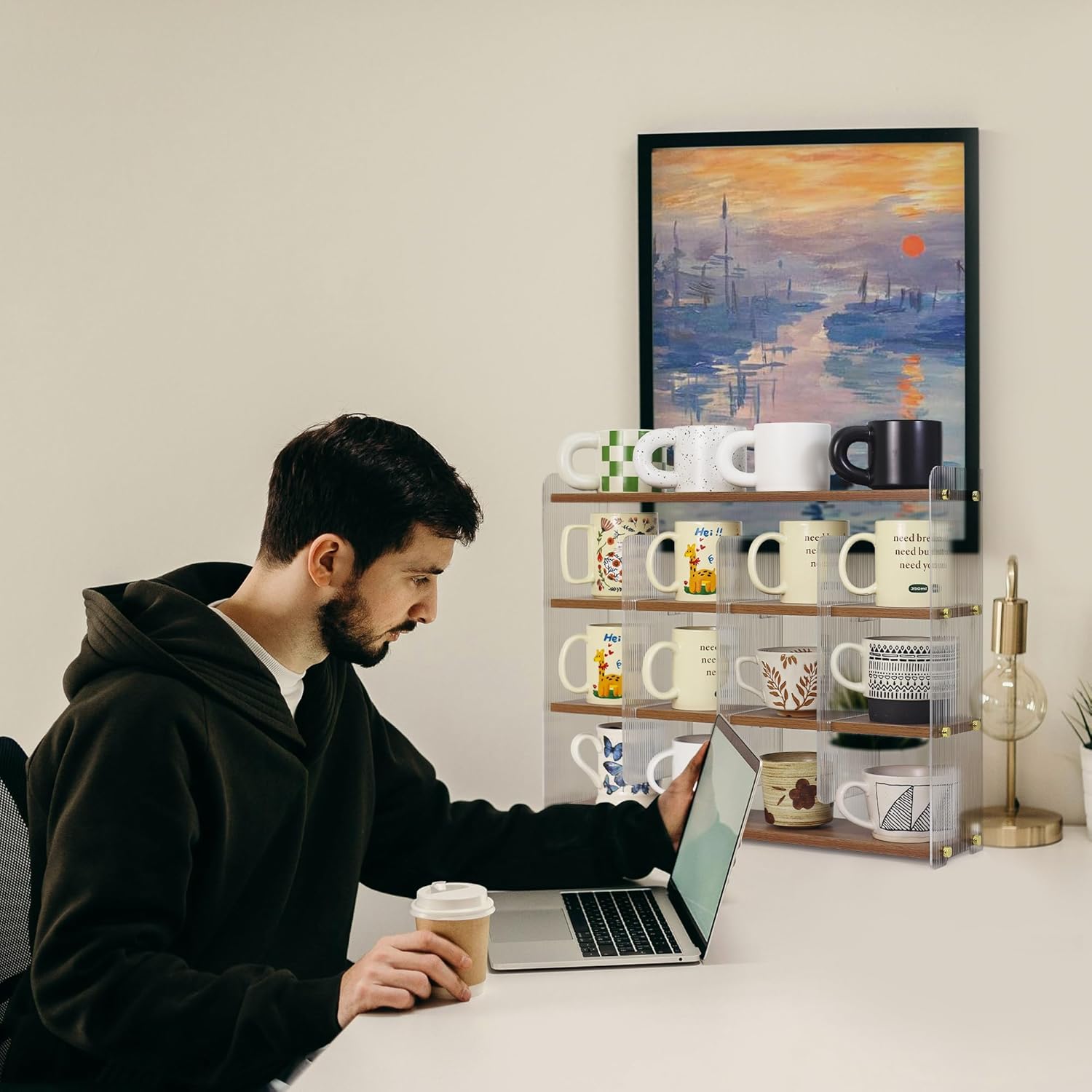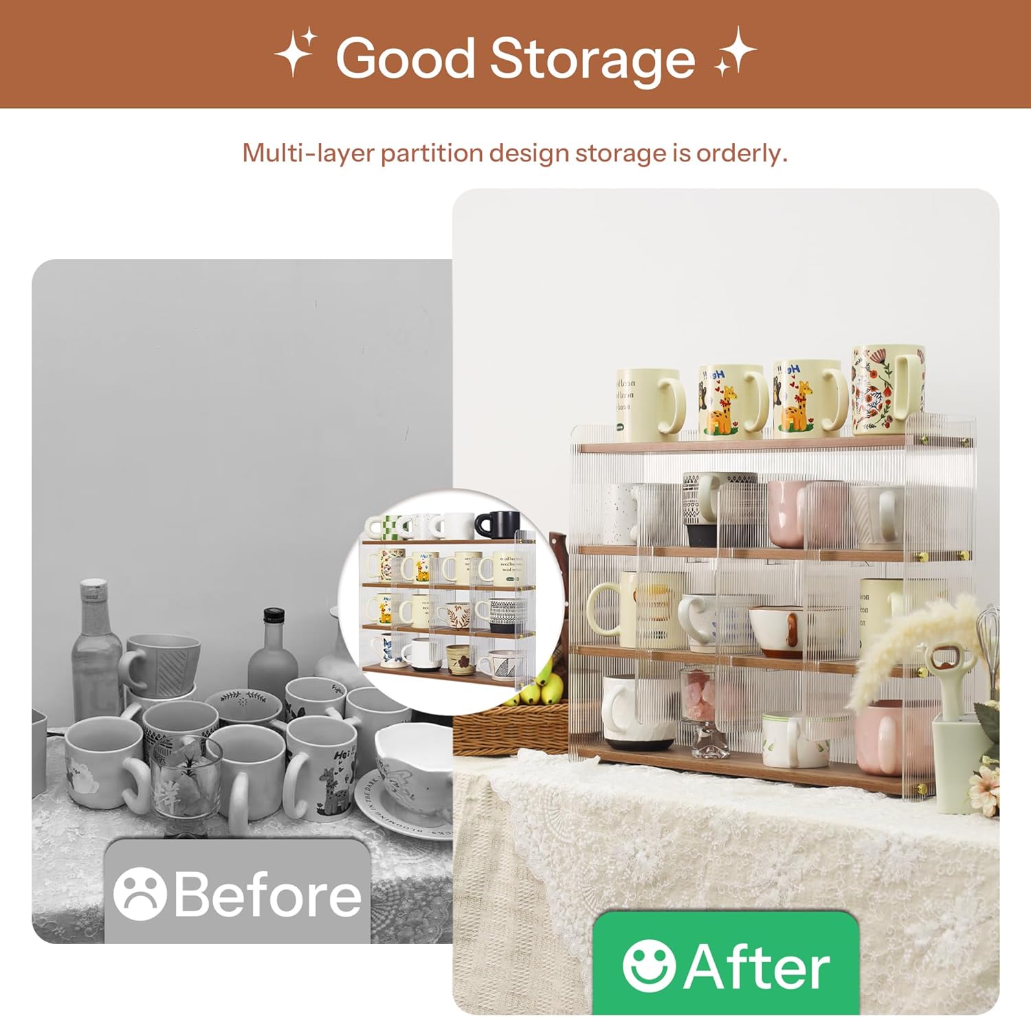 - Stylish Design: Featuring wavy acrylic side panels and a natural wood board. The sturdy construction ensures that it can hold the weight of multiple mugs without wobbling or tipping. this organizer presents an aesthetically pleasing texture, ideal for coffee bar enthusiasts and those who love to decorate their spaces.