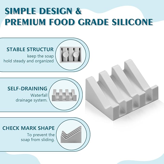 - Premium Silicone Construction: Our silicone soap dishes are made from high-quality, flexible silicone, ensuring durability and long-lasting use.