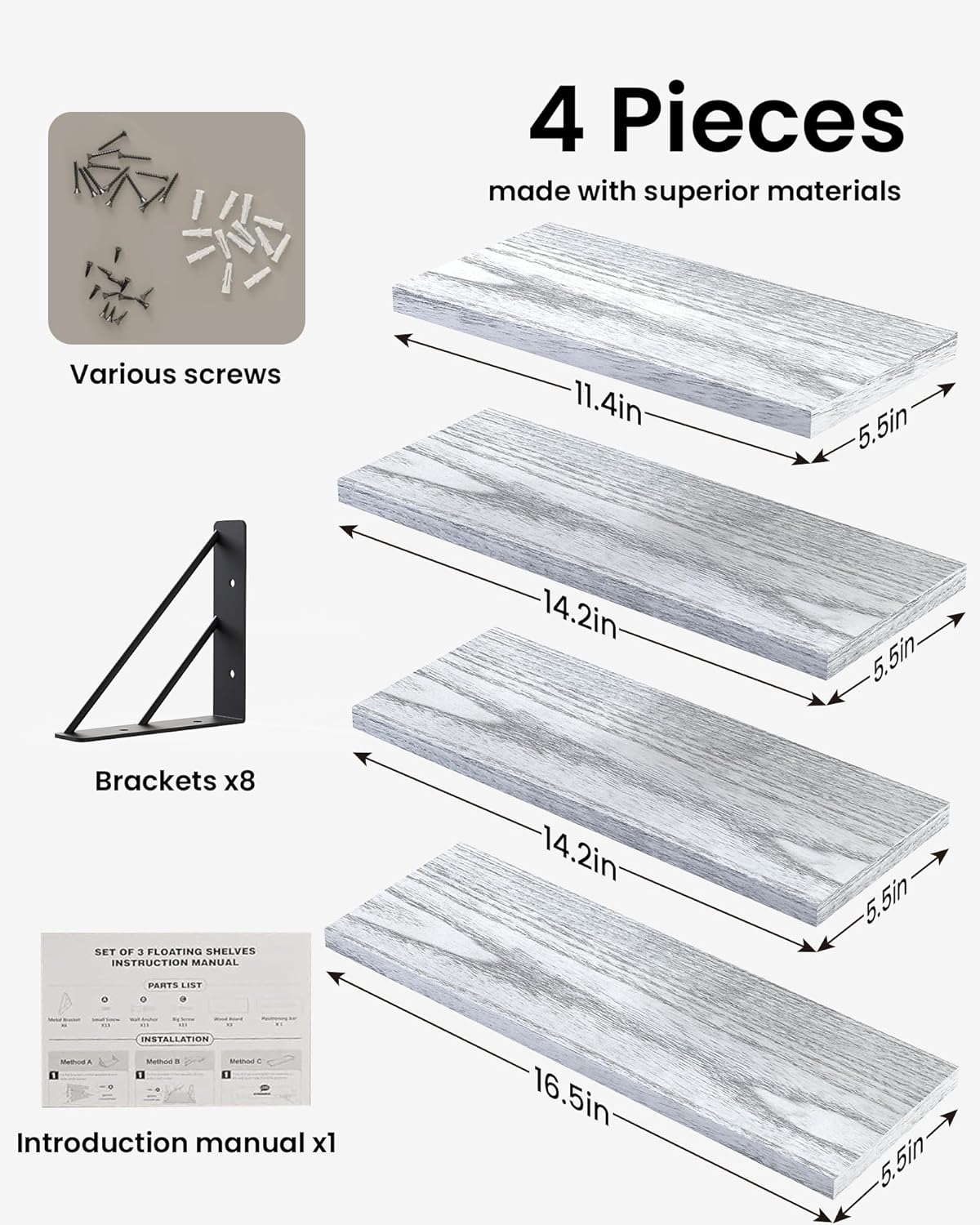 BAYKA Wall Shelves for Bedroom Decor, Floating Shelves for Living Room Kitchen Storage, Wall Mounted Rustic Wood Floating Shelves for Kids Books, Corner Shelf for Bathroom(Gray White,Set of 4)