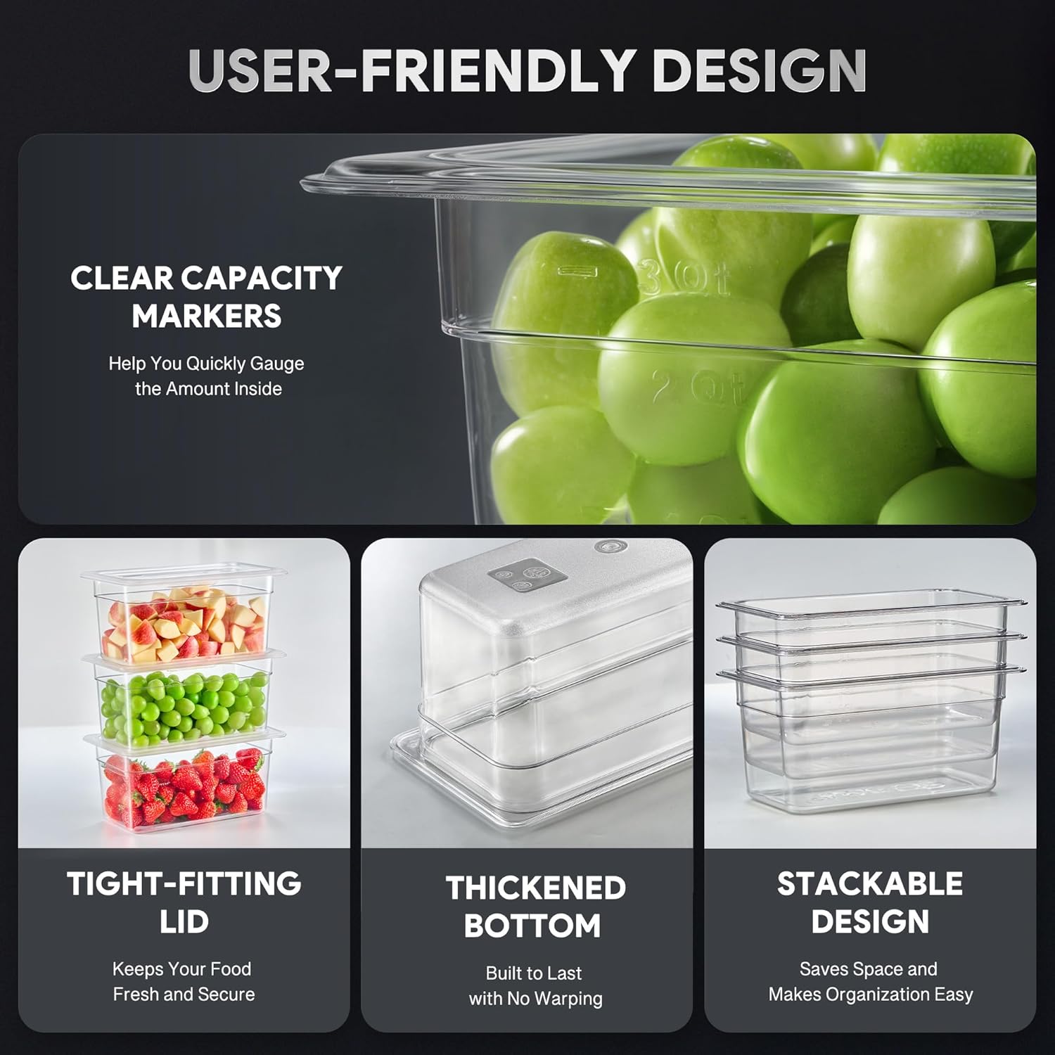 - Quick Access & Measurements: With a clear design, our plastic food pans let you easily see what's inside at a glance. The capacity markers on the side make it simple to check inventory and measure portions, making food organization & prep easier than ever