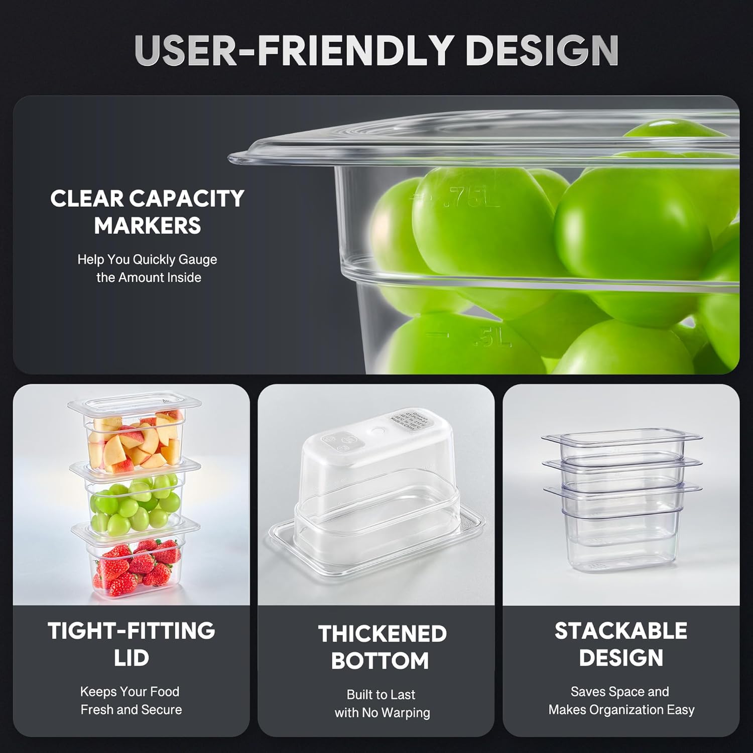- Quick Access & Measurements: With a clear design, our plastic food pans let you easily see what's inside at a glance. The capacity markers on the side make it simple to check inventory and measure portions, making food organization & prep easier than ever