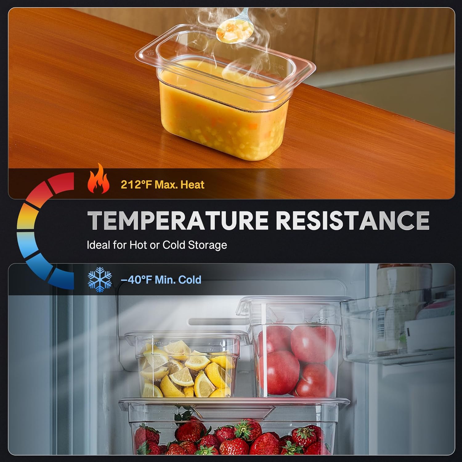 - Food-Grade & NSF-Listed: Made from food-grade PC material and NSF-listed for safety, these hotel pans provide a safe, contaminant-free way to store your food. Withstanding temps from -40°F to 212°F, they're perfect for pantry, fridge, or on-the-go use