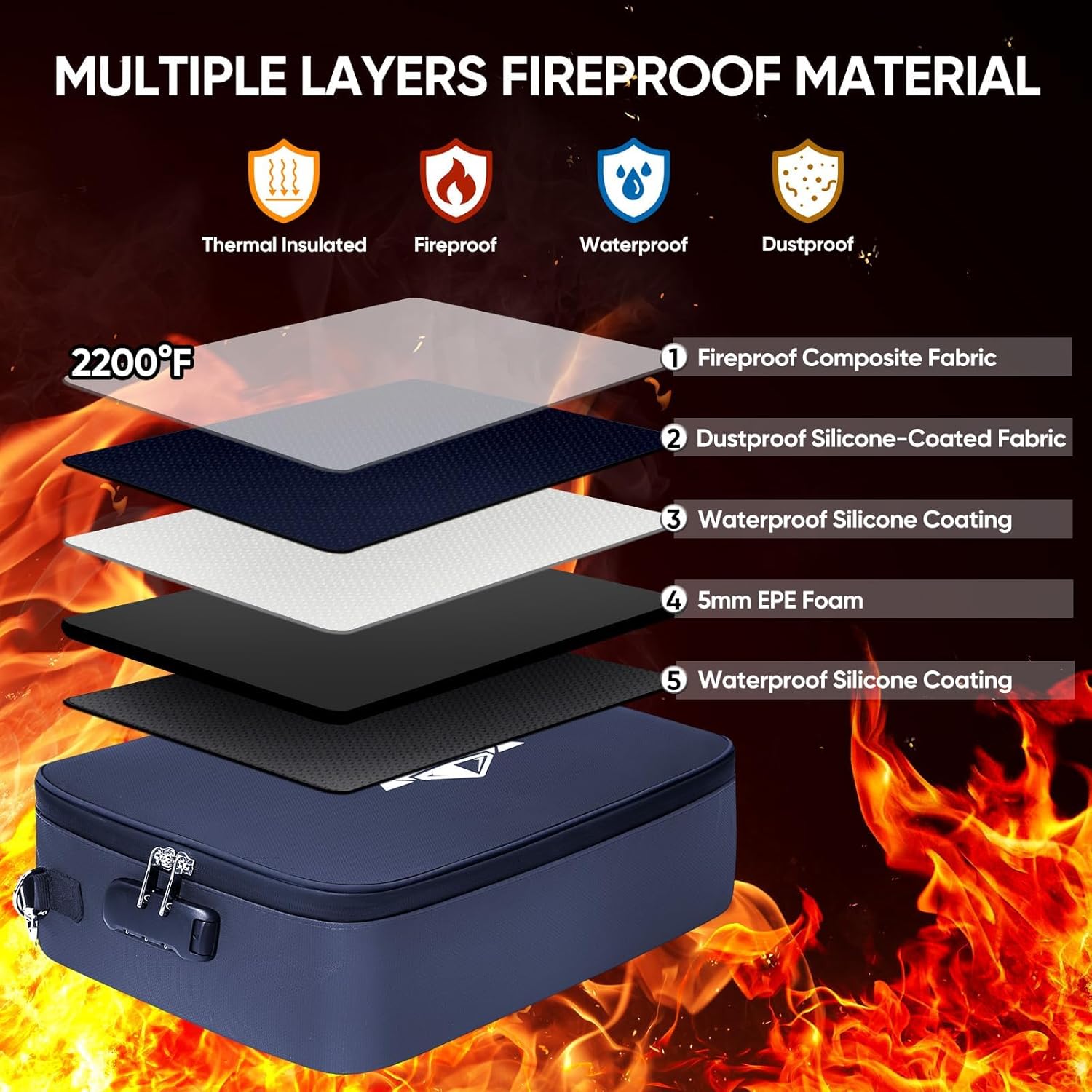 - Fireproof and Waterproof: The fireproof document bag is made of dust-proof silicone fiberglass, offering fire resistance up to 2192℉, SGS-certified (UL94 VTM-0); Its waterproof design protects your documents from rain and spills (No folders included)