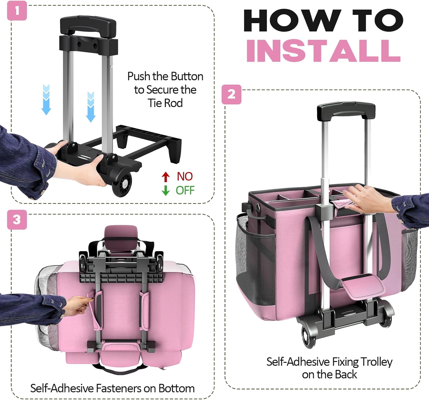 - 4 Carrying Ways: This housekeeping tote bag has 2 reinforced padded carry handles, 2 short side carry handles, 1 detachable telescopic trolley and 1 adjustable shoulder strap, multiple ways to use for various cleaning and transportation scenarios. The cleaning cart with wheels is a great companion for cleaning professionals who need to work on the go and make your cleaning work easier.
