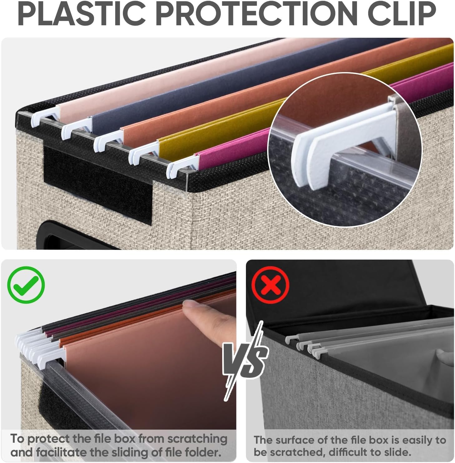 - [UNIVERSAL SIZE] Our file box with lid fits letter-sized files. It is designed for efficiency and functionality, with its smooth PVC slide rails on both sides, you can effortlessly slide file folders for easy access and neatly arranged. The lid fits snugly on the box after hanging folders. (NOTE: file folders are not included)