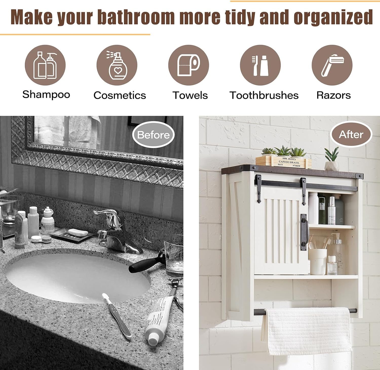 Bathroom Wall Cabinet, Farmhouse Medicine Cabinet with Sliding Barn Door & Adjustable Shelves, Wall Mounted Storage Cabinet for Toilet, Kitchen, Living Room (Antique White)