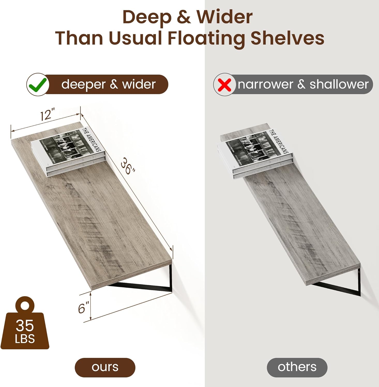 - Deep Floating Shelves - Measuring 36 inches wide and 12 inches deep, our wall shelves are widened to add additional storage and display space, perfect for use as bookshelves or floating nightstands