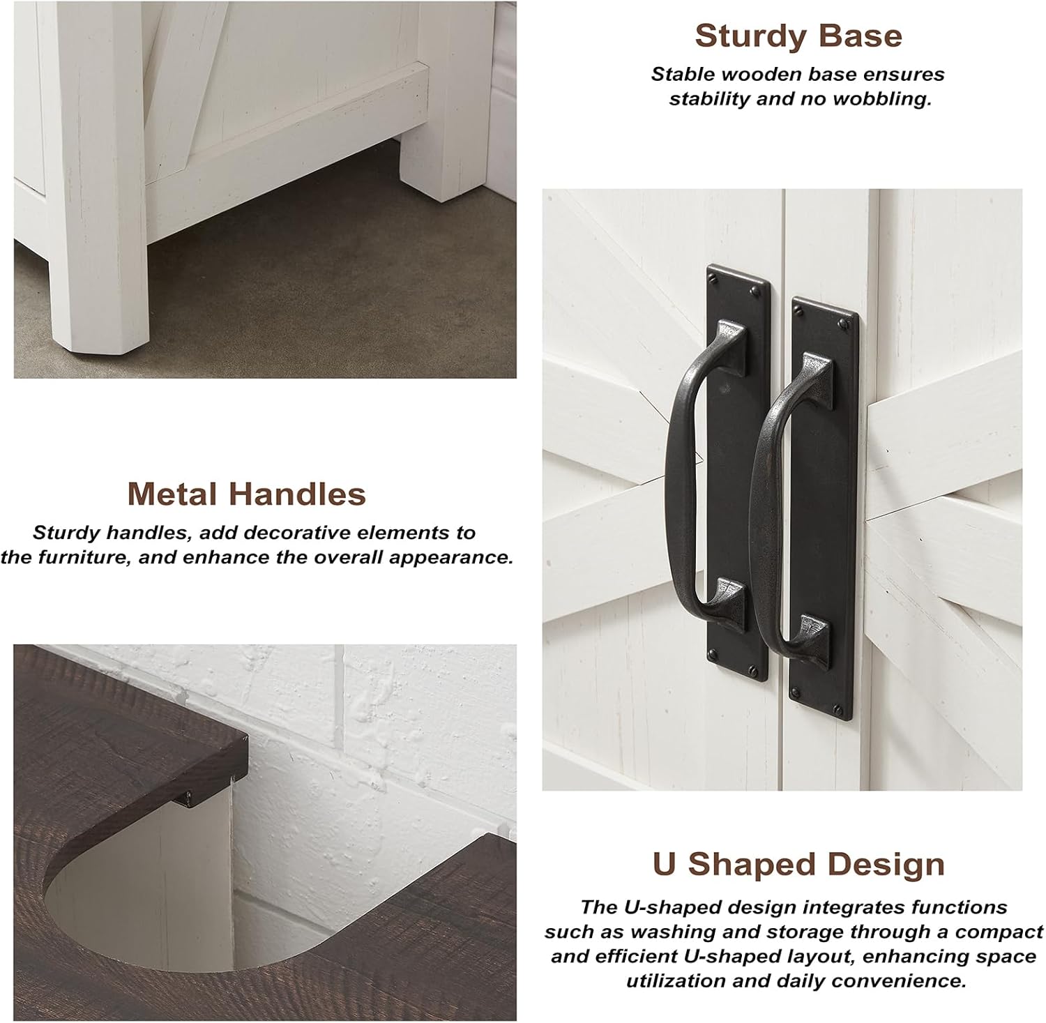 - Farmhouse style: The bathroom sink cabinet is designed in farmhouse style, incorporating barn door elements and metal handle beautification for more coordination and easy integration with your furniture style