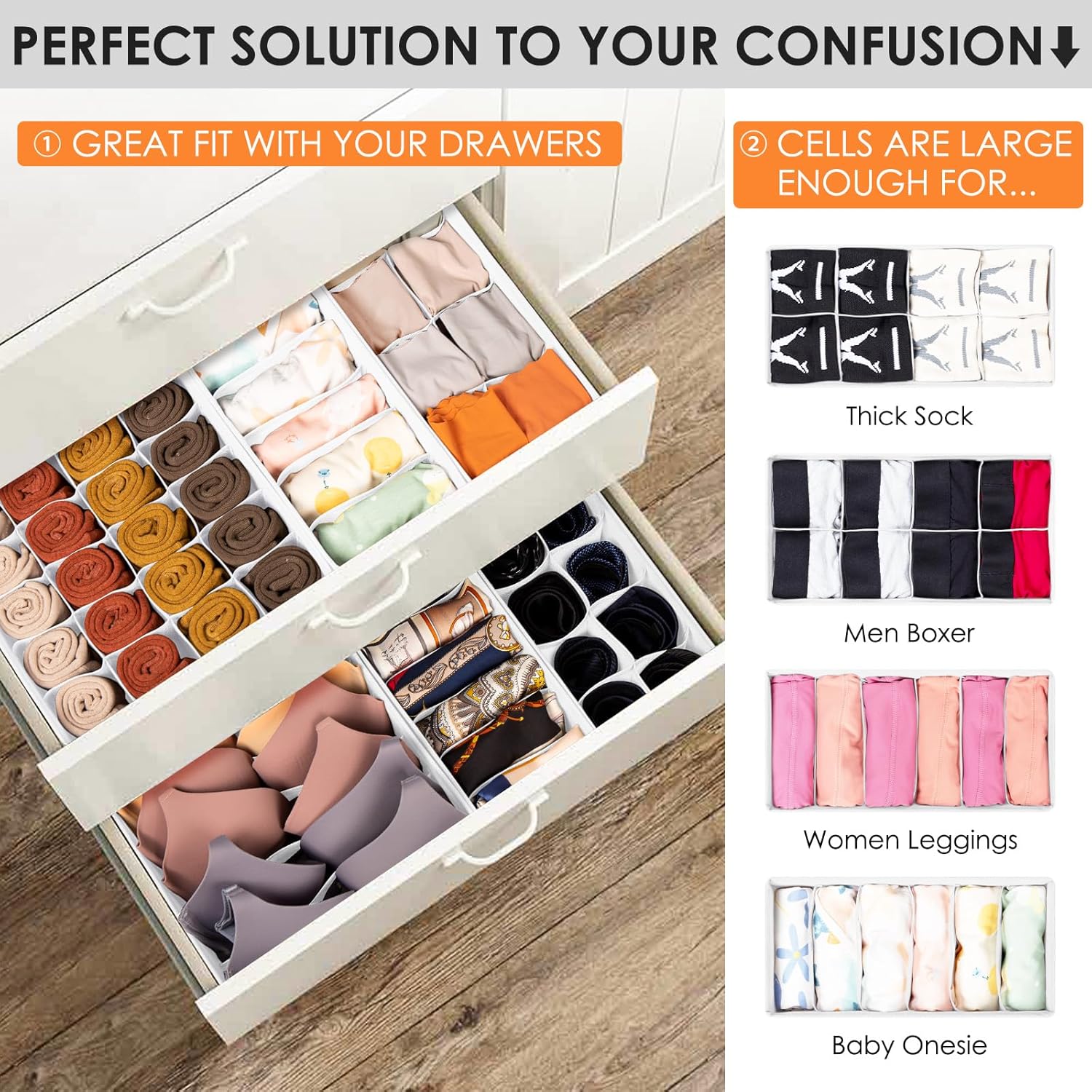 - 【COMPARTMENTS FOR MULTI STORAGE USE】Compared to others, our 16 pack drawer organizer set has 5 sizes for various storage needs. No matter it's knee sock, men boxer brief, or women leggings, they will all perfectly fit into our clothes organizer. Great for bedroom organization and dorm room storage.