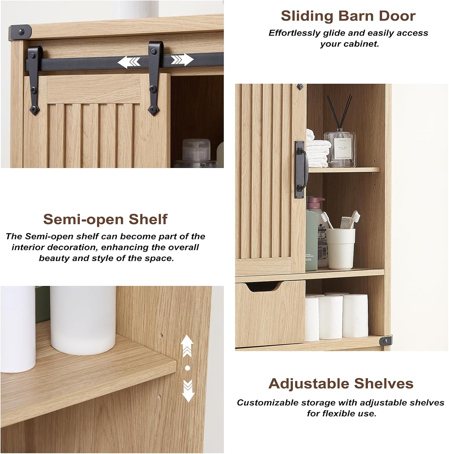 Over The Toilet Storage Cabinet, Farmhouse Storage Cabinet with Adjustable Shelves and Sliding Barn Door, Free Standing Over Toilet Bathroom Organizer (Natural Oak)