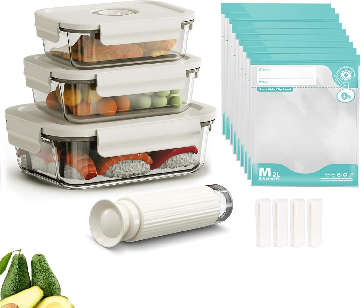 17 PCS Borosilicate Glass Food Vacuum Storage Containers, Vacuum Seal, Airtight,Pantry Kitchen Storage, Meal Prep, Lunch, Leftovers,3 Containers, 10 Reusable Food Saver Sealer Bags,4 Sealing Clips